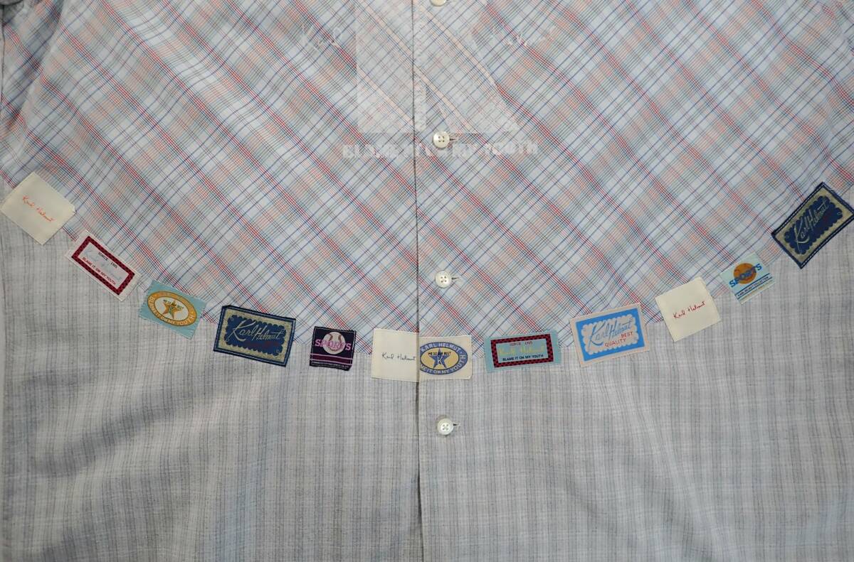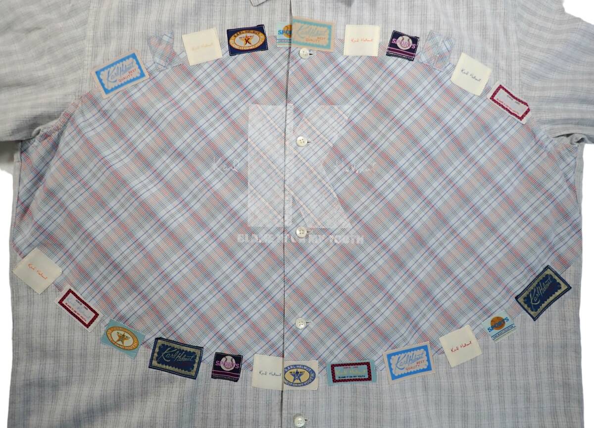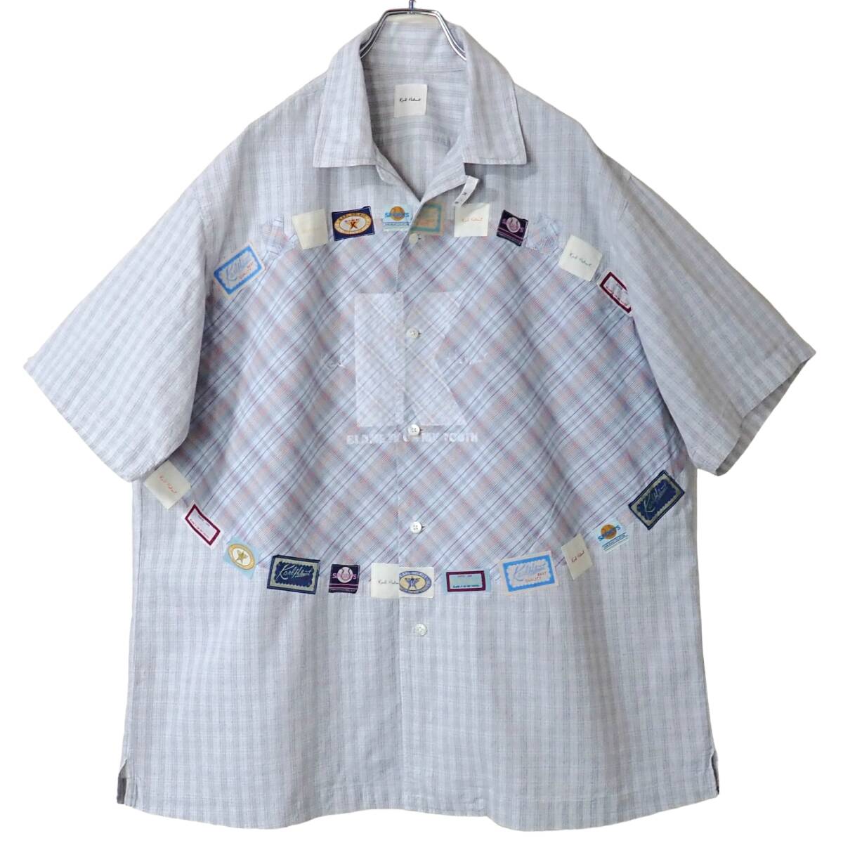 備考 Karl Helmutのmade in JAPAN、二種類のチェック柄を組み合わせたBODYに複数のネームタグ、ワッペンのパッチワーク、センターにはプリント入りの非常に凝った半袖オープンシャツです。 クリーニング、プレス済。