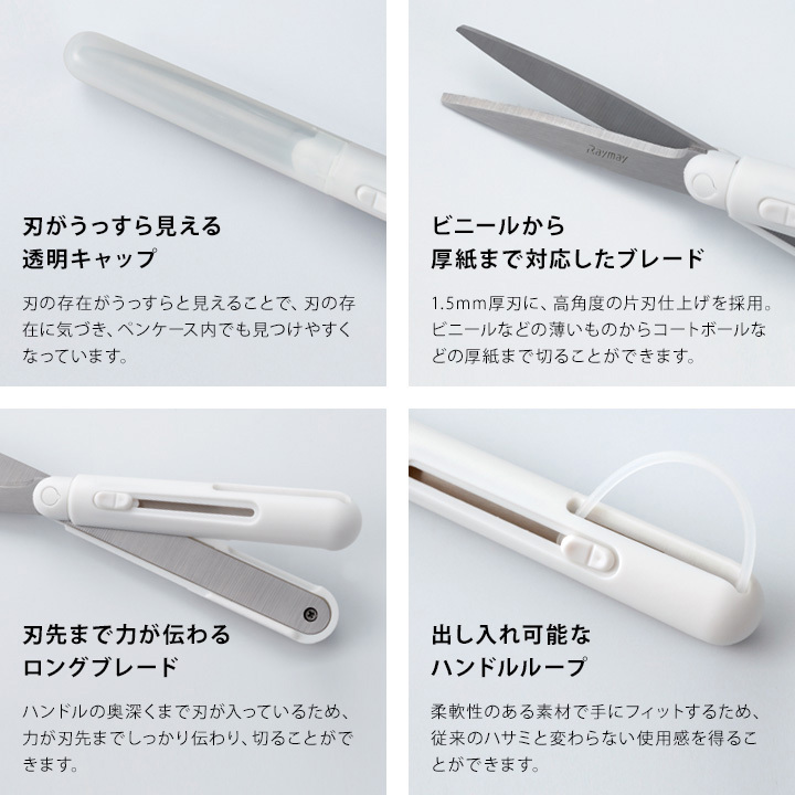 出し入れ可能なハンドルループは柔軟性のある素材で手にフィットし、従来のハサミと変わらない使用感。