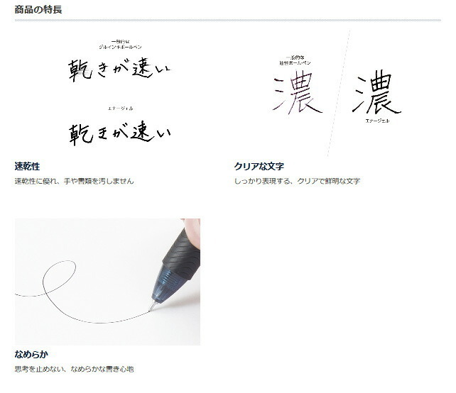 エナージェルインキは、紙に素早くインキが浸透するので、大切な書類や手を汚しにくい速乾性が特長です。