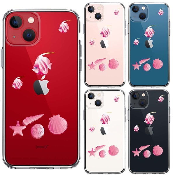 iPhone13mini ケース クリア夏 熱帯魚 と 貝 ピンク スマホケース 側面ソフト 背面ハード ハイブリッド