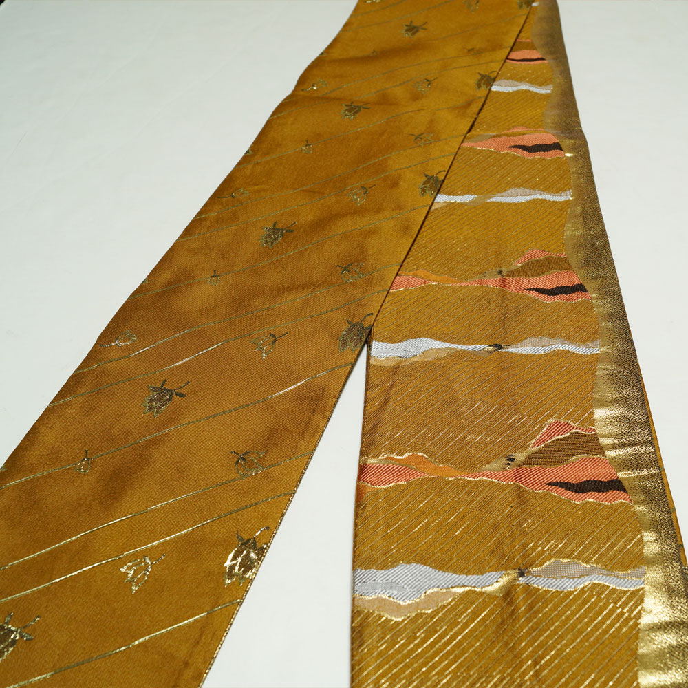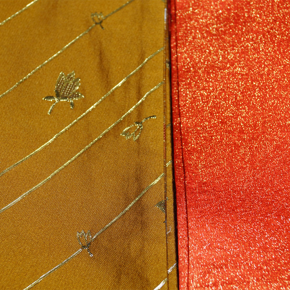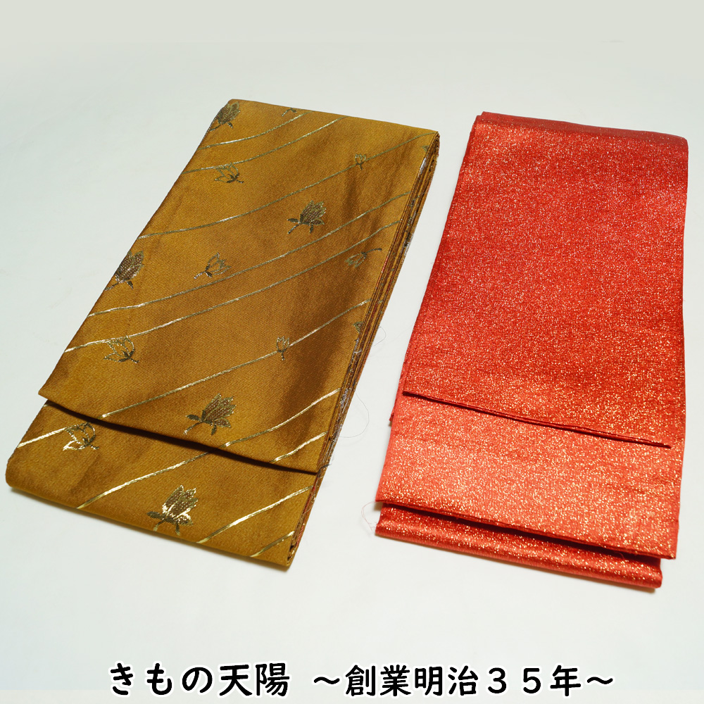 | 状 態 | ※ランク2 ともに使用されており、使用感、着用スレ、着用キズ、糸引き、変色、保管臭、帯端の糸の飛出しなどが点在しています。また、茶色系の方には自作のポケットが施されておりますが、かなり雑です。また、垂れ先・手先はかがっておりません。 赤色系の方は手先から50㎝位までのところには帯芯は入っておりません。 |