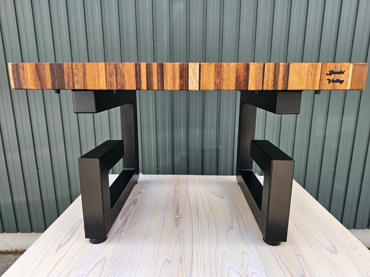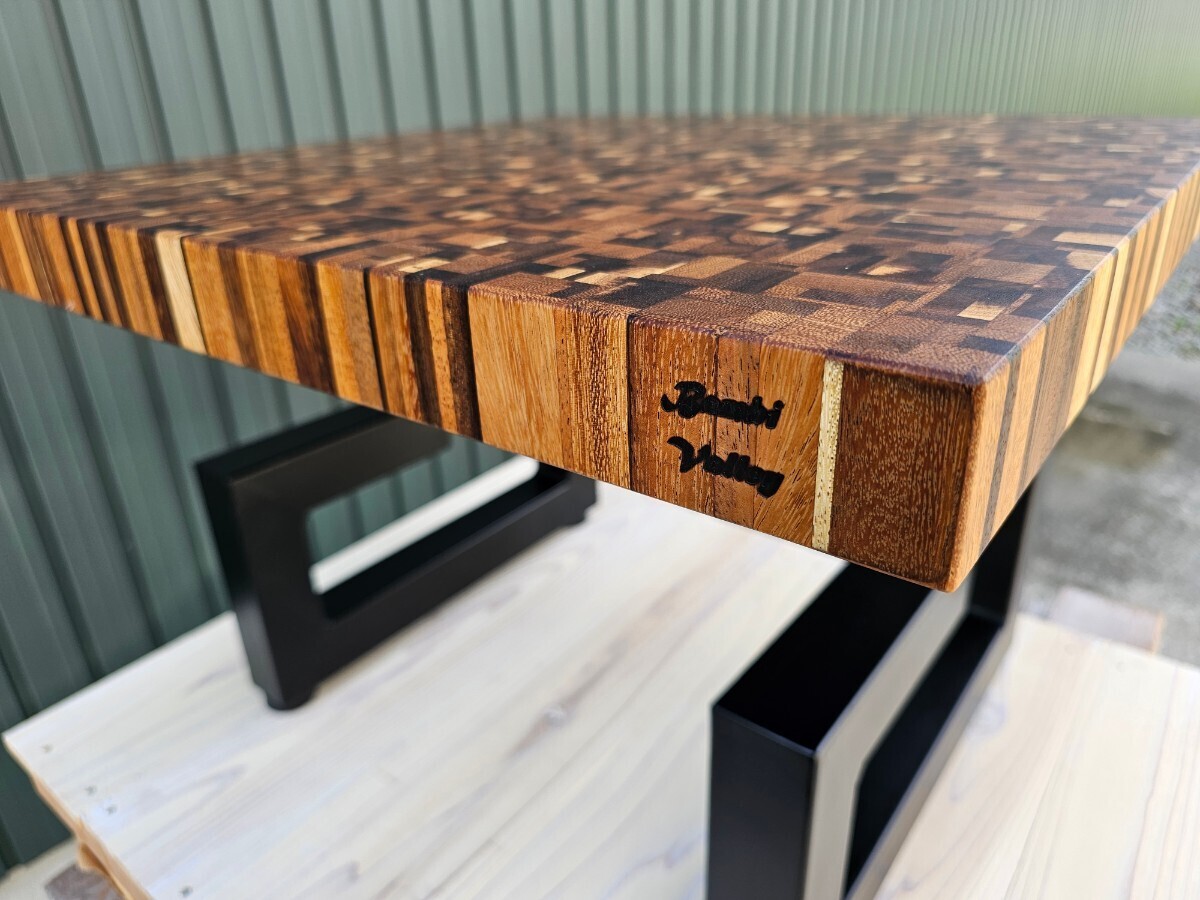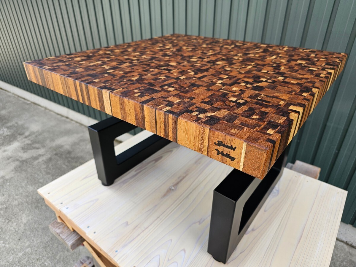 様々な色が混じってますがモンキーポッドのみを使用しています。1枚の板からそれぞれ色の違う部分を切り出して組み合わせて造りました。