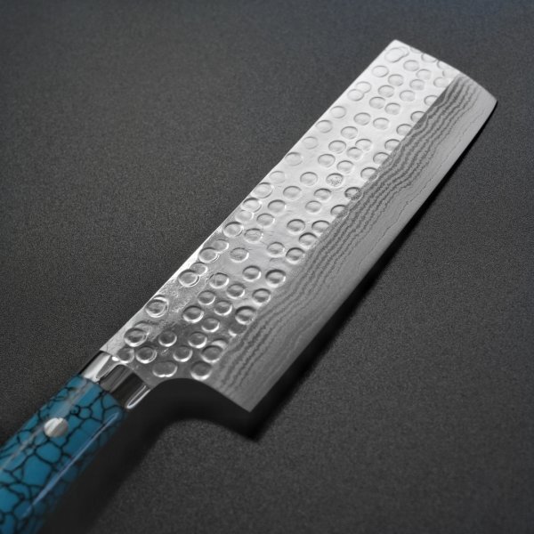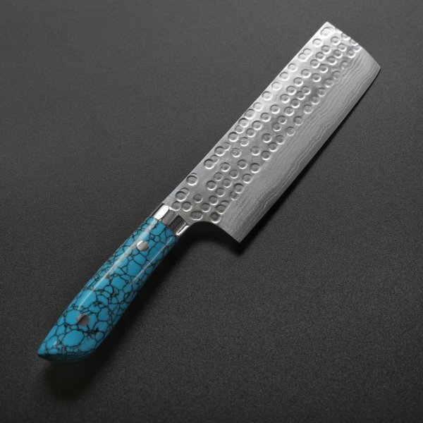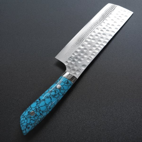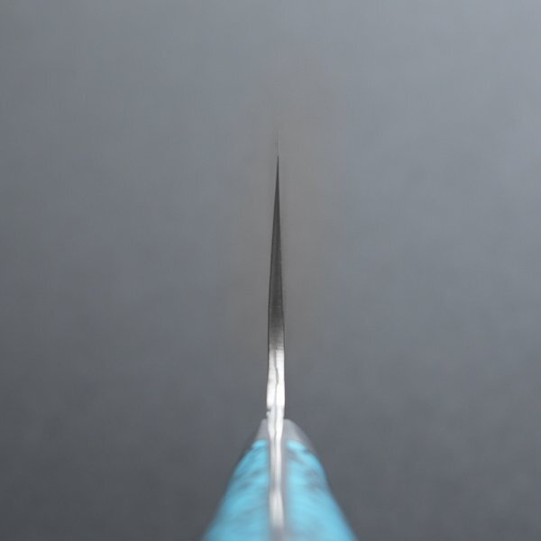 目を引く人工のブルーターコイズは耐久性や耐水性も優れ、伝統的工芸品としての包丁に更に華を添えています。ハンドルの形状は手にフィットするように一本一本職人の手によって削り出され、非常に手間をかけて作りあげられています。
