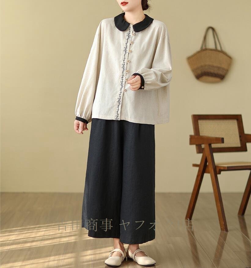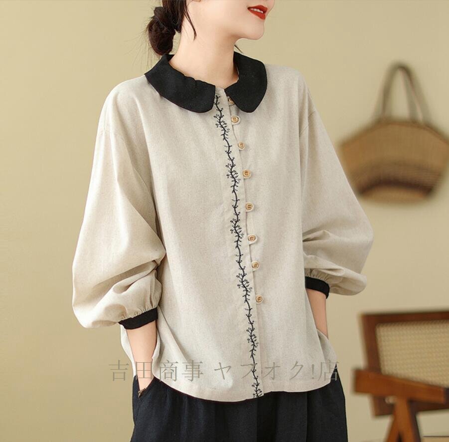 A1083☆新品綿麻 シャツ レディース ブラウス チュニック 刺繍り 長袖 リネン シャツ ナチュラル ゆったり 可愛い きれいめ L