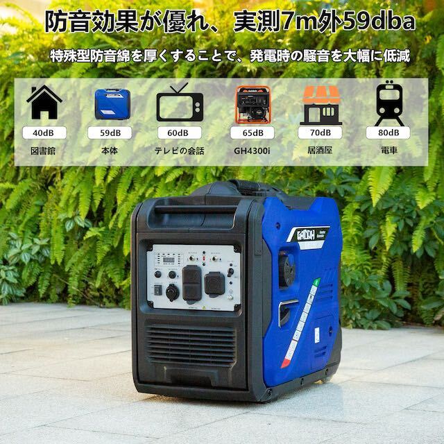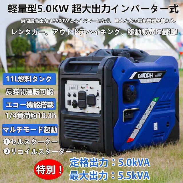 【軽量でコンパクトなのに5000Wの高出力】4サイクルOHVエンジン搭載し、力強いエンジンでありながら、高品質の正弦波電力を生み出し、様々な家庭電気機器を使用できるように作られております。定格出力を5.0kVA(最大5.5kVA)を作れるGH2700iはアウトドア生活を楽しむ方々や、移動販売もしくは移動生活される方にはGH6250iが活躍するでしょう。