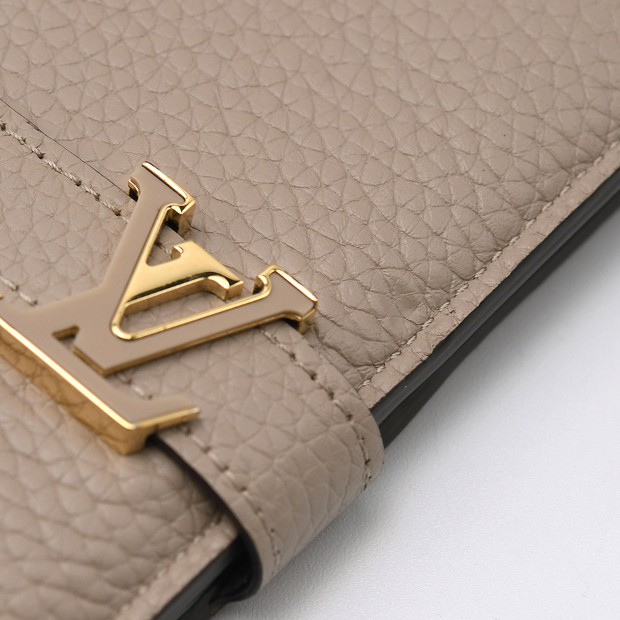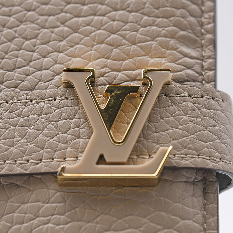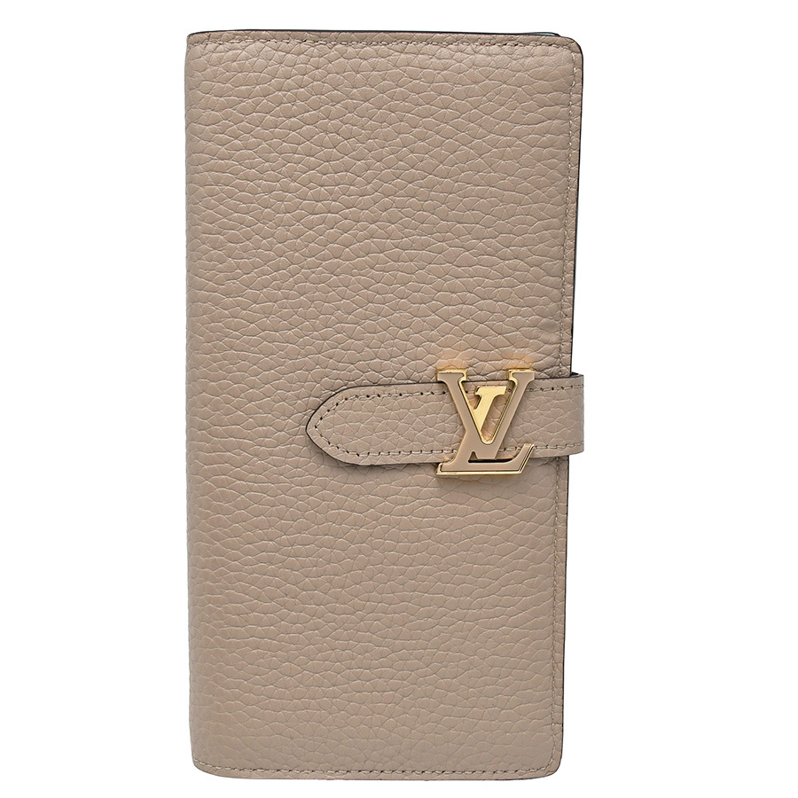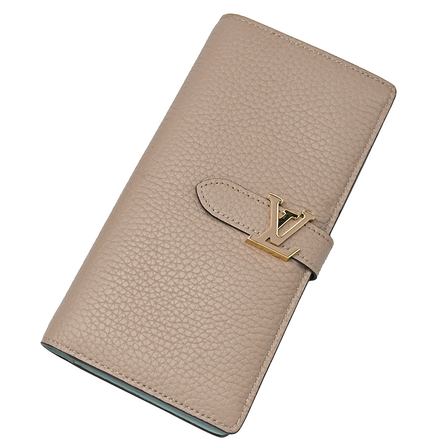 金具に小キズ、内側のレザーに若干シワやわずかな薄汚れあり。 その他特に目立つダメージはなく大変綺麗な状態です。 しなやかなトリヨンレザーでエレガントに仕上げた、ヴィトンの長財布"LV ヴェルティカル ウォレット"が入荷しました。 内側には8つのカードスロット、ファスナー付きコインポケット、チケットや紙幣用の大ぶりの「V」シェイプのスロットを備えています。 独特のスライドスタイルの留め具には、アイコニックなバッグ「カプシーヌ」から着想を得たLV イニシャルのアクセサリーがあしらわれた、おすすめのアイテムです。 |