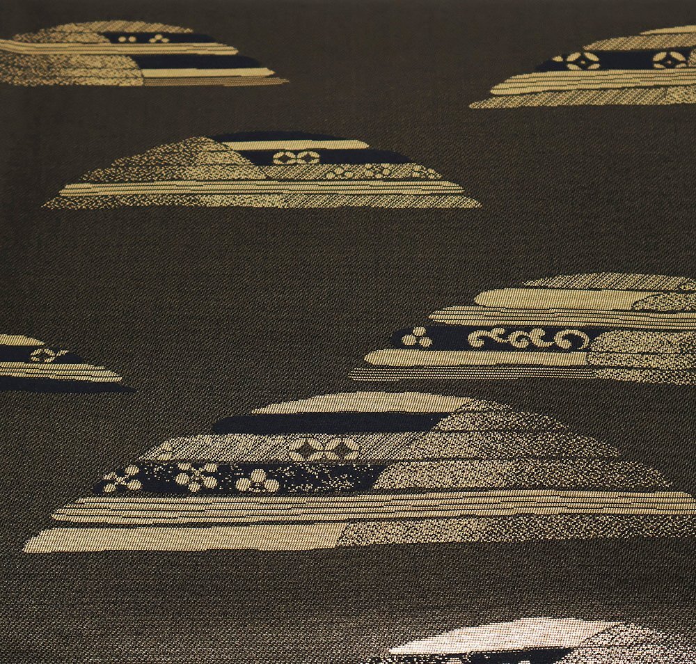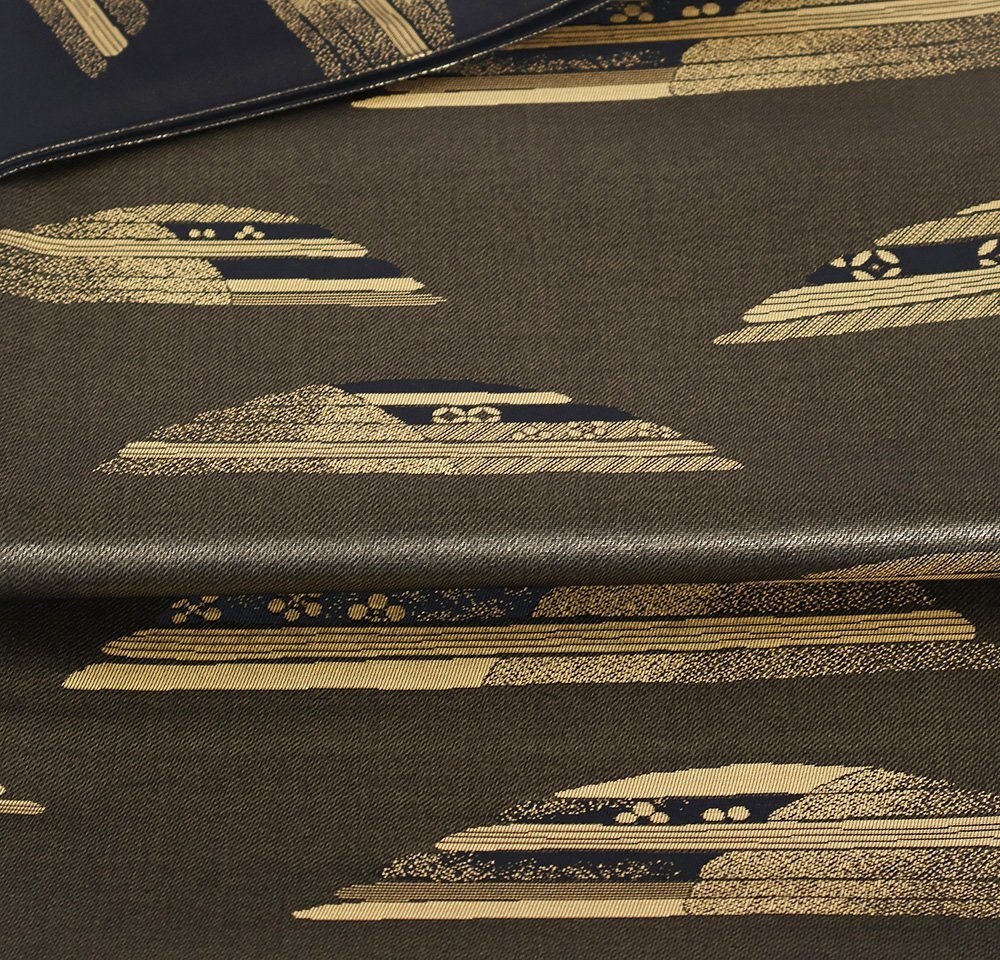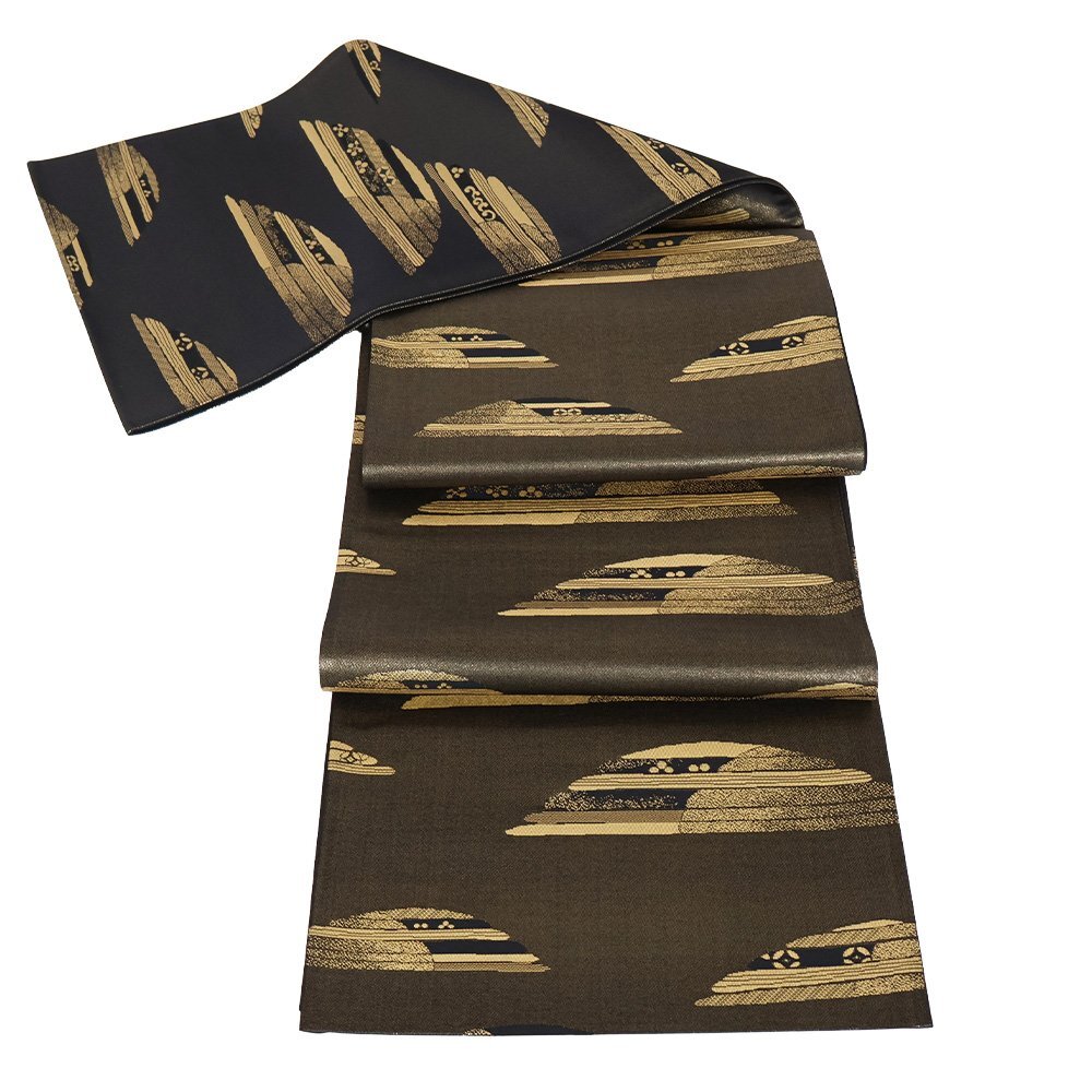 | 西陣織袋帯 箔想ひ 黒金地 遠山紋 梅鉢・七宝 新品 仕立て上がり | |
