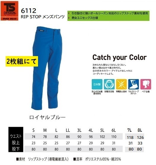 ビックイナバ特価◆TSDESIGN 6112 RIP STOPメンズパンツ【41ロイヤルブルー・6Lサイズ】定価1枚7480円の品が、2枚組で即決2980円