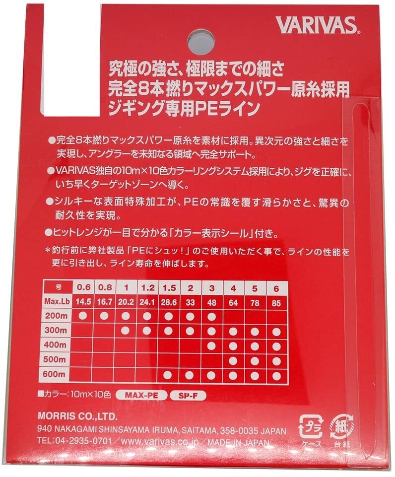 「VARIVAS(バリバス) PEライン アバニ ジギング10×10 マックスパワーPE X8 300m 1.2号 24.1lb 8本 10色」▼4513498104632▼(商品説明)300m・10色 1.2号 (MAX.24.1LB) ・・Size:1.2号 (MAX.24.1LB)Style:300m・号数:1.2・巻量:300m・撚り数:8本撚り説明 究極の強さ、極限までの細さ。完全8本撚りマックスパワー原糸採用。VARIVAS独自の10m×10色、ジギング専用ライン・完全8本撚りマックスパワー原糸を素材に採用。異次元の強さと細さを実現し、アングラーを未知なる領域へ完全サポート。 ・VARIVAS独自の10m×10色(テン・バイ・テン)カラーリングシステム採用により、ジグを正確に、いち早くターゲットゾーンへと導く。 ・シルキーな表面特殊加工が、PEの常識を覆す滑らかさと、驚異の耐久性を実現。 ・ヒットレンジが一目で分かる「カラー表示シール」付き。 ・リールに貼って使える便利な「号数シール」付き。