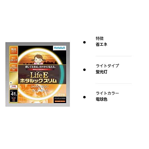 「ホタルクス(HotaluX) FHC41EL-LE-SHG2」▼4904323403523▼(商品説明)・電球色 41形 FHC41EL-LE-SHG2・・Color:電球色Size:41形・定格ランプ電力41W 口金GZ10q・3波長電球色3000K41W形・質量155g口金G13 電球色・寸法管径16.5×外径447mm・ホタルクス残光タイプ 寿命18000時間説明 消灯後も真っ暗にならない残光機能を持ったランプです。スイッチを切った後、しばらくの間薄明りで照らしますので暗闇での移動や防災用に最適です