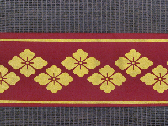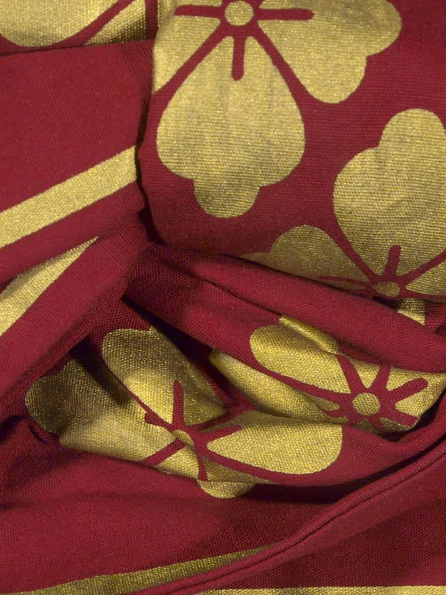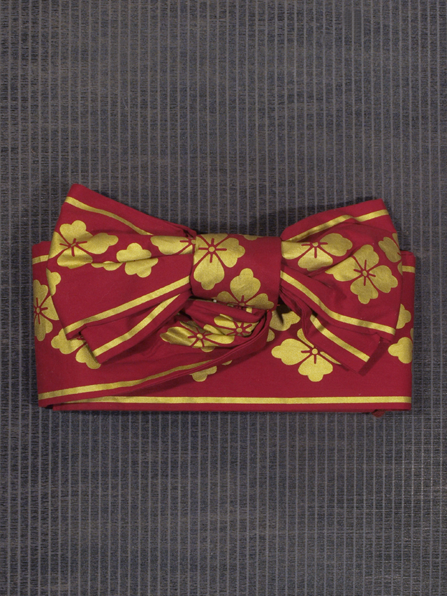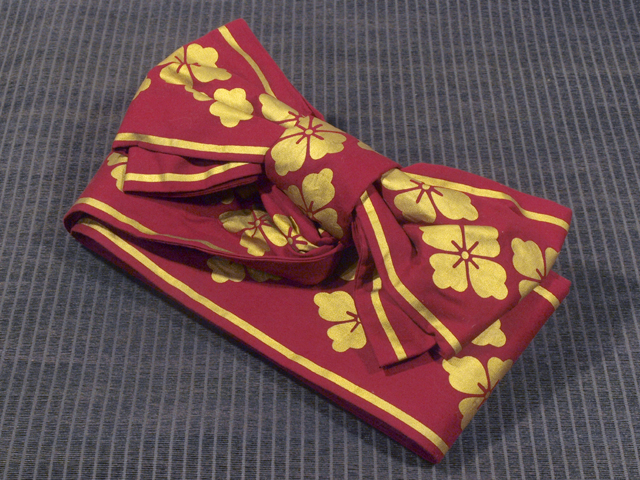 深緋(こきひ)色の地に、黄金色の縞と唐花菱の文様が染められている、綿の文庫結びの付け帯です。結び部はつくられているタイプです。 シンプルですが、和の趣が雅びな印象です。結び部と胴回り部はひと続きになっている ユーズド品で、うっすらとした結びジワが若干あるほか、胴回り部の端部に直径約 3mm のうすよごれが 1 か所ありますが、そのほかに目につく大きなしみやよごれ、褪色などのダメージはなく、全体的にはきれいな状態です。 |