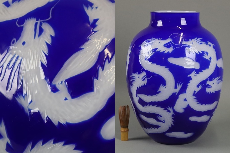 中国美術 乾隆ガラス 乾隆硝子 龍紋 花瓶 高41cm 切子 唐物 工芸硝子 細密細工 古美術品[c993]