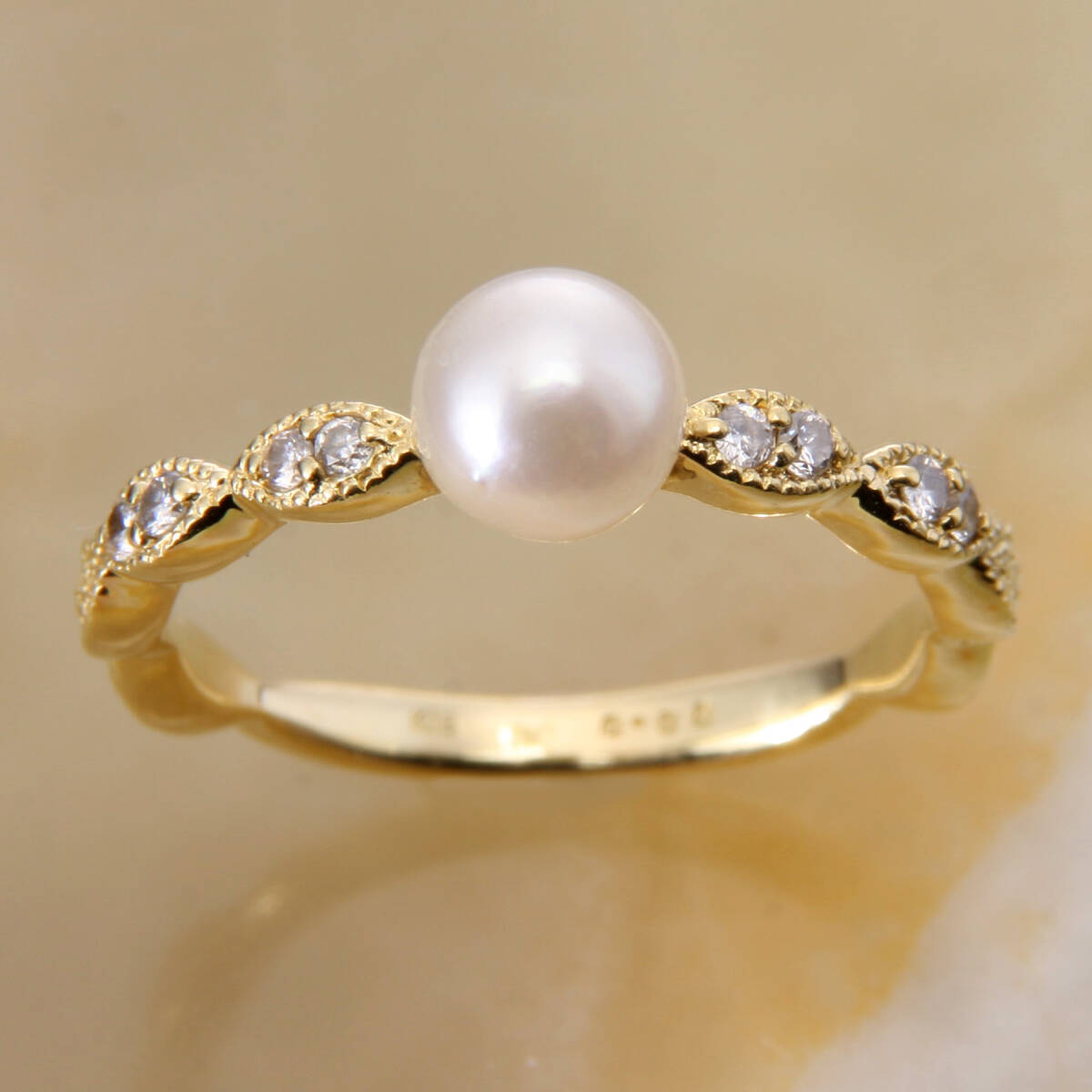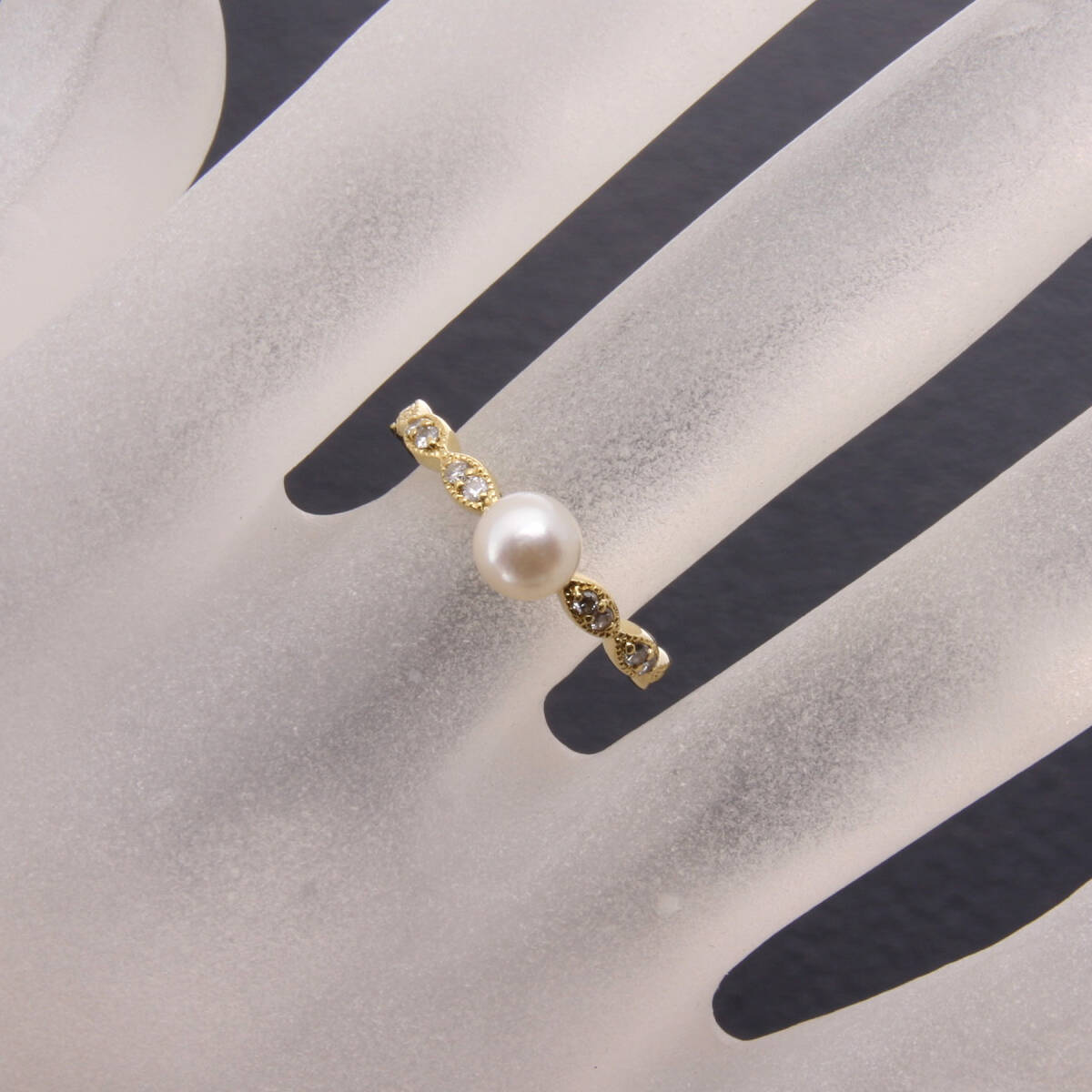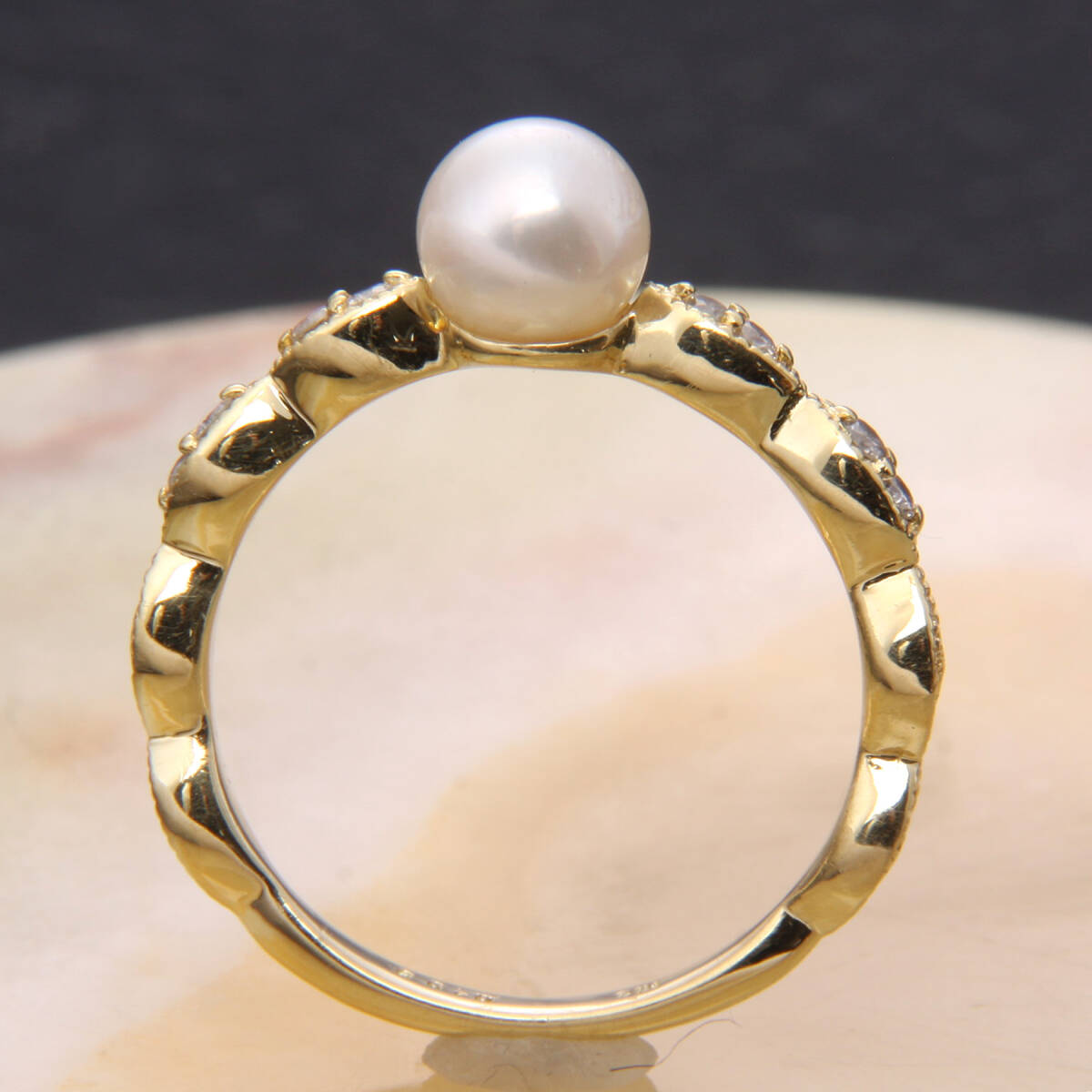 K18製、アコヤ養殖真珠とダイアモンドの7号リングです。