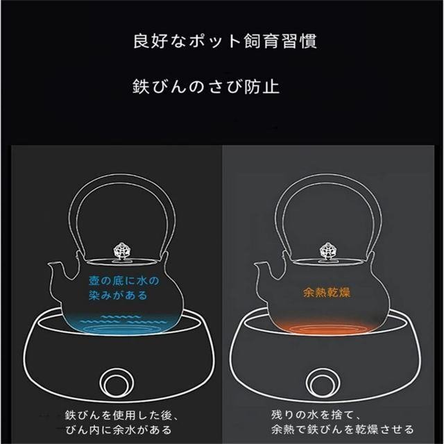 素材:鉄 容量:約1.2L ガス、 電気コンロ、炭火、IH調理器対応できます。 新品鉄 瓶の使い始め 鉄瓶内部を軽くすすいで水を八分目ほど入 れて、お茶の葉を茶さじ1~2杯程入れ20分ほど煮込んで ください。 中を水ですすいでから、お湯を沸かして捨てる作業を2~3回行ってからご使用ください。 ※加熱時は 蓋をずらしてください。沸騰したお湯が飛び出すのを防 ぎます。 ※色は光の加減で見え方が変わることがありますのでご 了承願いします 。