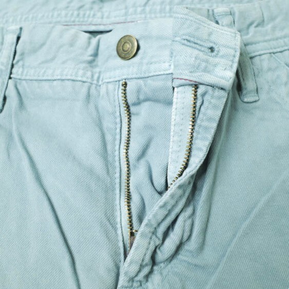 ウォッシュ加工による柔らかい生地感やヴィンテージライクな色落ち、ターコイズに近いライトブルーカラーが◎。