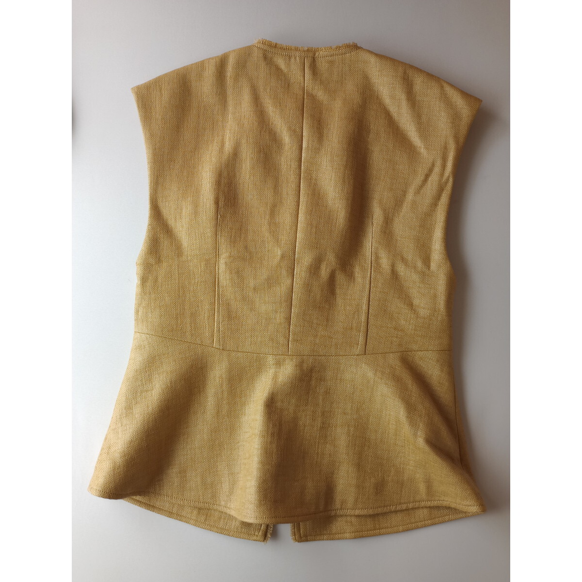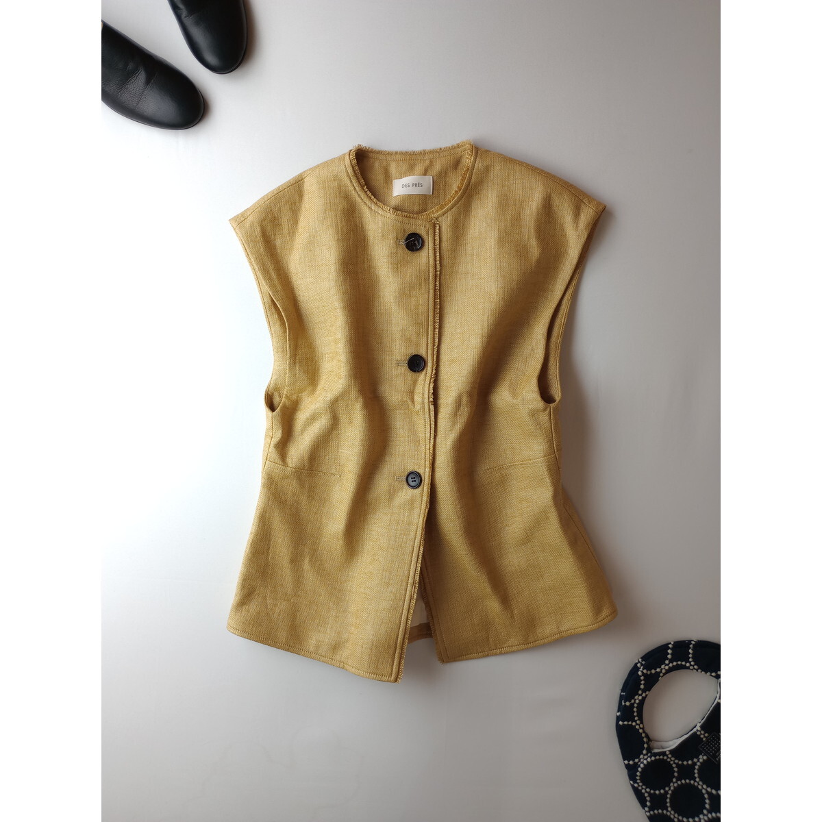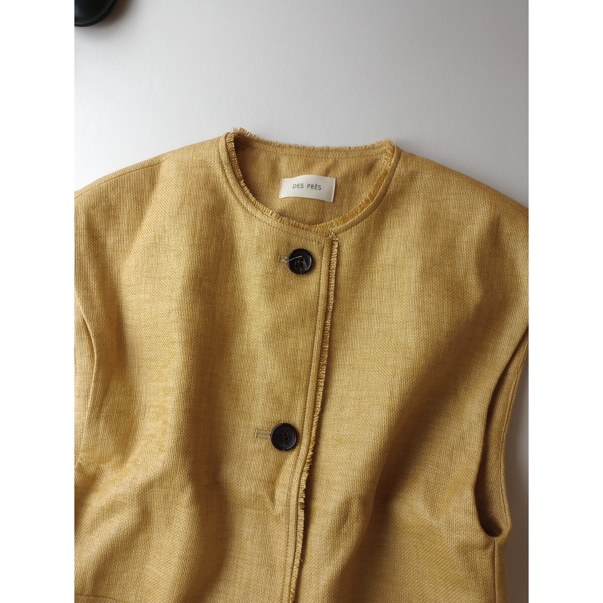 特徴: 24SS 定価55000円です。テ糸にコットンを、ヨコ糸にナイロンのラフィア調の糸を使用し織り上げた、イタリアメーカーならではの品の良い光沢としっかりとしたハリ感が魅力的です。ジレはマニッシュな印象のアイテムながら、ほど良くボディラインに沿う美しいシルエットやフレンチスリーブのデザインで女性らしさを感じある一枚です。 襟ぐりとフロントのフリンジディテールもさりげないポイントです。特にダメージもなくまだまだご愛用いただけます。