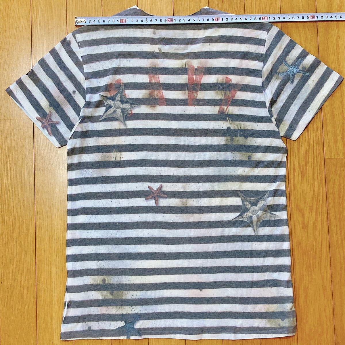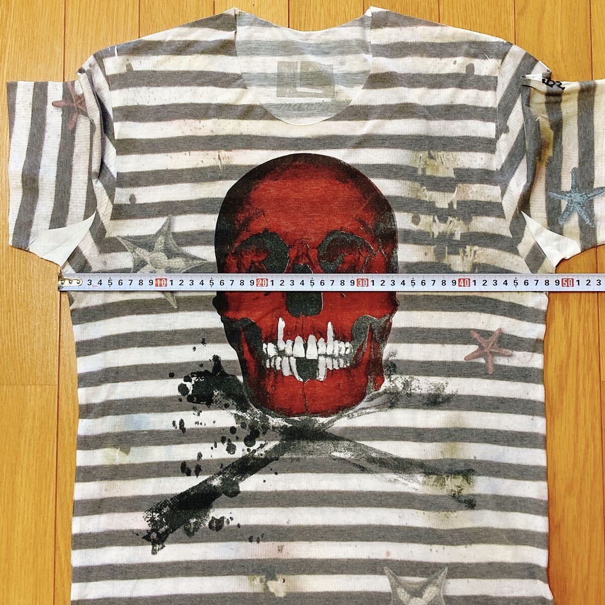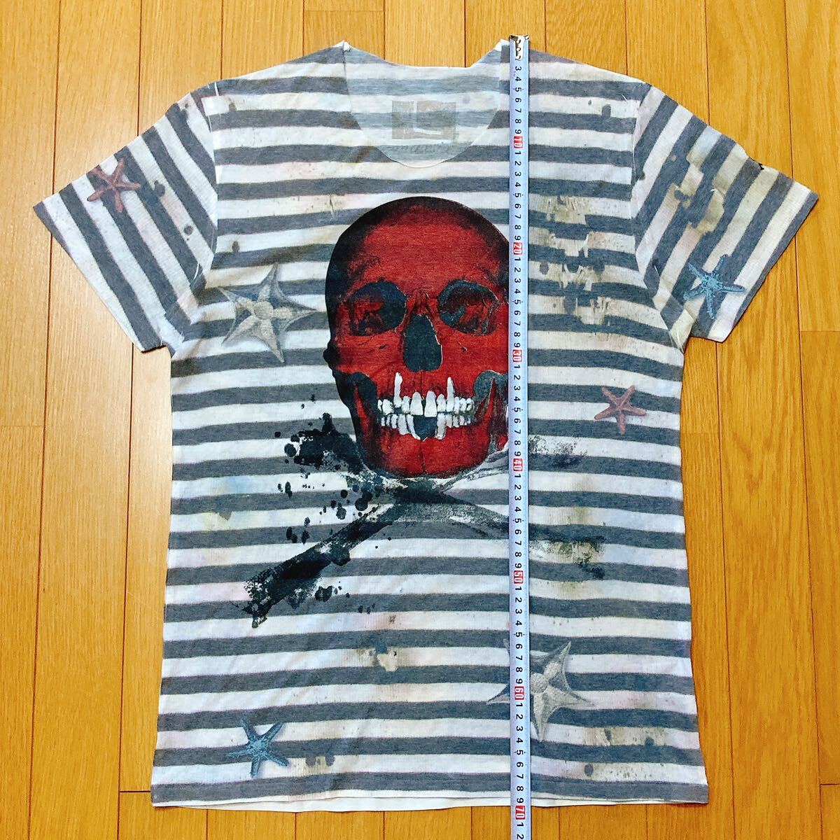 サイズはLで、くすんだブリーチ柄生地にグレーボーダー柄、赤色ドクロ、ヒトデを配したデザインの1着です。