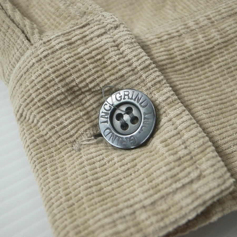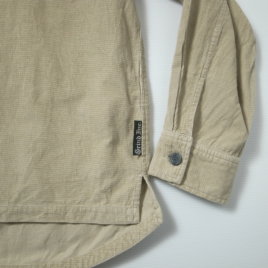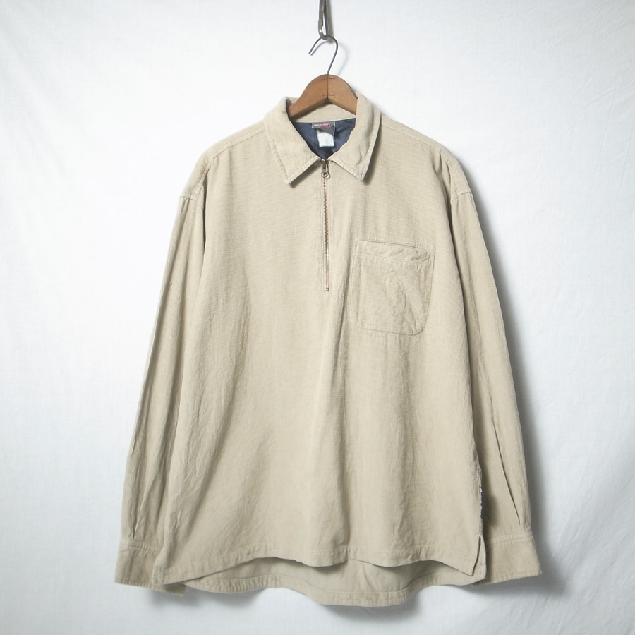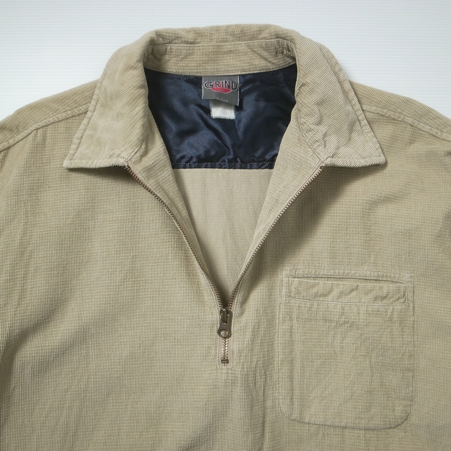 90年代頃グラインドのハーフジップシャツになります。オールドスケートの中でもコアなブランドでデザインはシンプルな物が多くSK8に馴染みの無い方にもお勧めです。素材はコットン100%でコーデュロイの畝が線では無く点の様になった珍しい生地を使用しています。