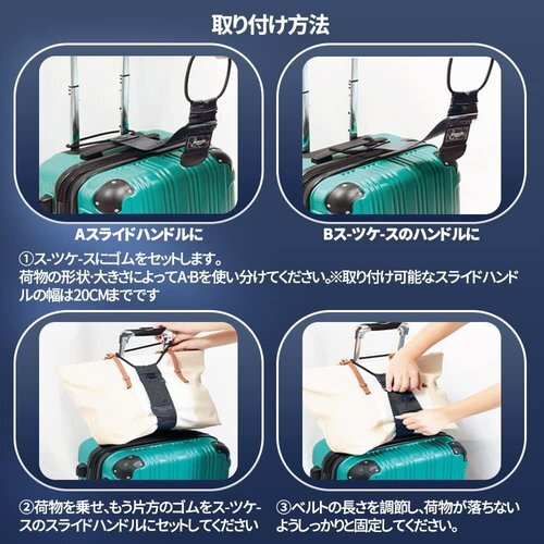 【使い方】 スライドハンドル付旅行用鞄に使用 スライドハンドルに片側のゴムをかけ、ベルトの上に載せる荷物をおき、もう一方のゴムをハンドルにかける ゴムを両方ハンドルにかけ、ベルト部にストールやミニバックをかけることも可 使用しないときはコンパクトに収納できるので、旅のお供におすすめ。