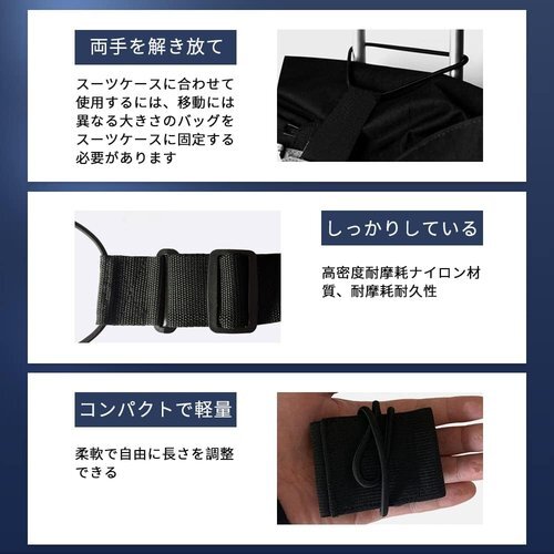 【製品の特徴】 丈夫で安心、小さくて軽い、両手が自由になる、荷物と一緒に使える、旅行の必需品、様々なサイズのバッグを荷物に取り付けられる