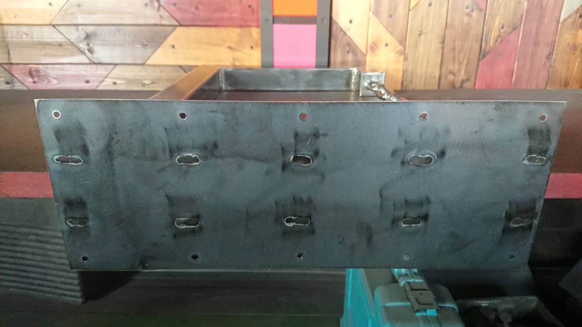 天板受けに10本のビス穴(φ5mm)を開けて皿モミ(φ10mm)加工を施しております。