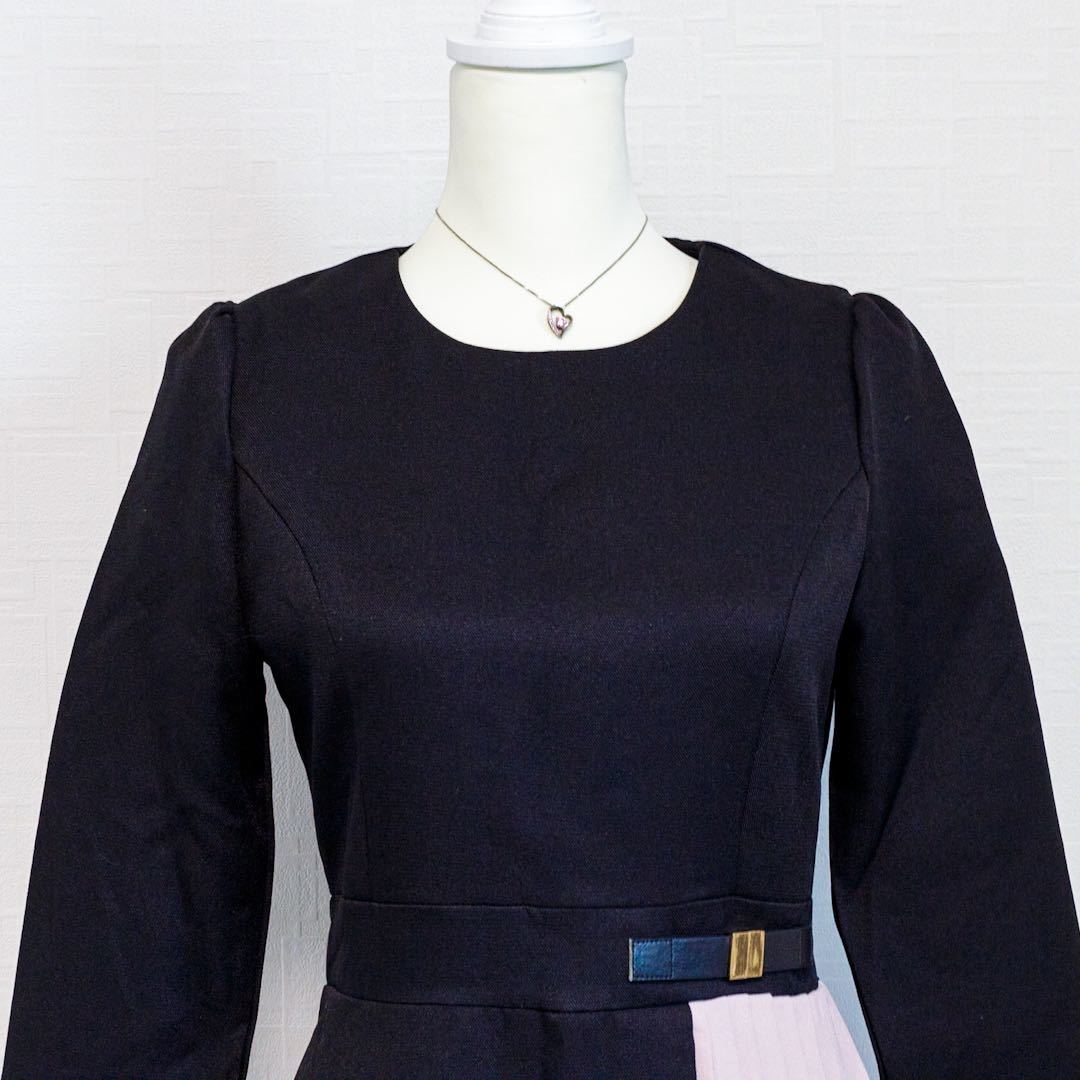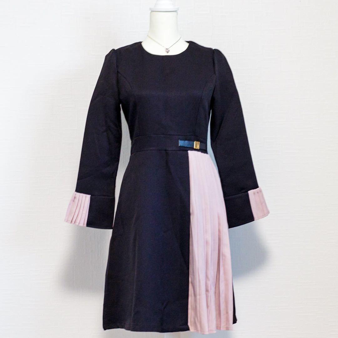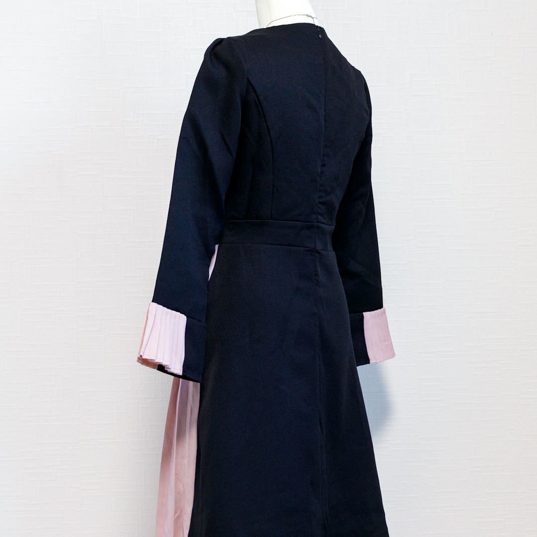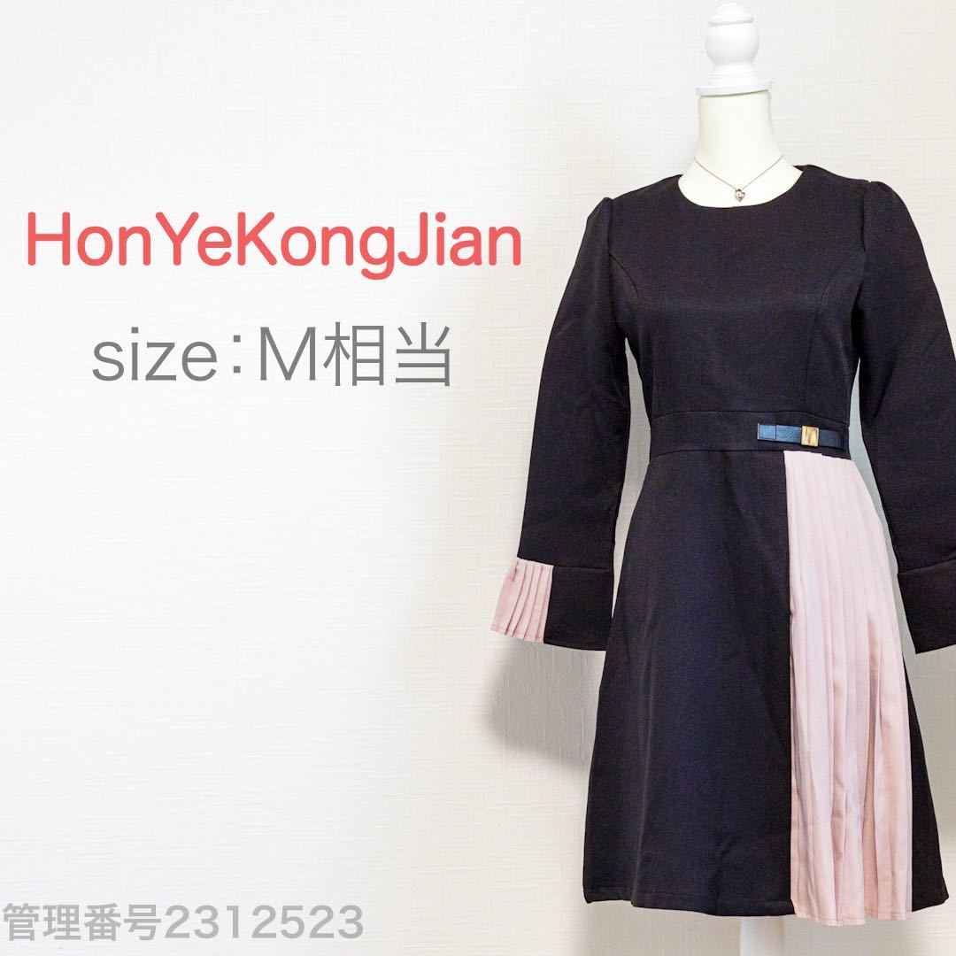【最終値下げ☆美品☆】HonYeKongJian サイドプリーツ切替 バイカラー 長袖 ひざ丈ワンピース M
