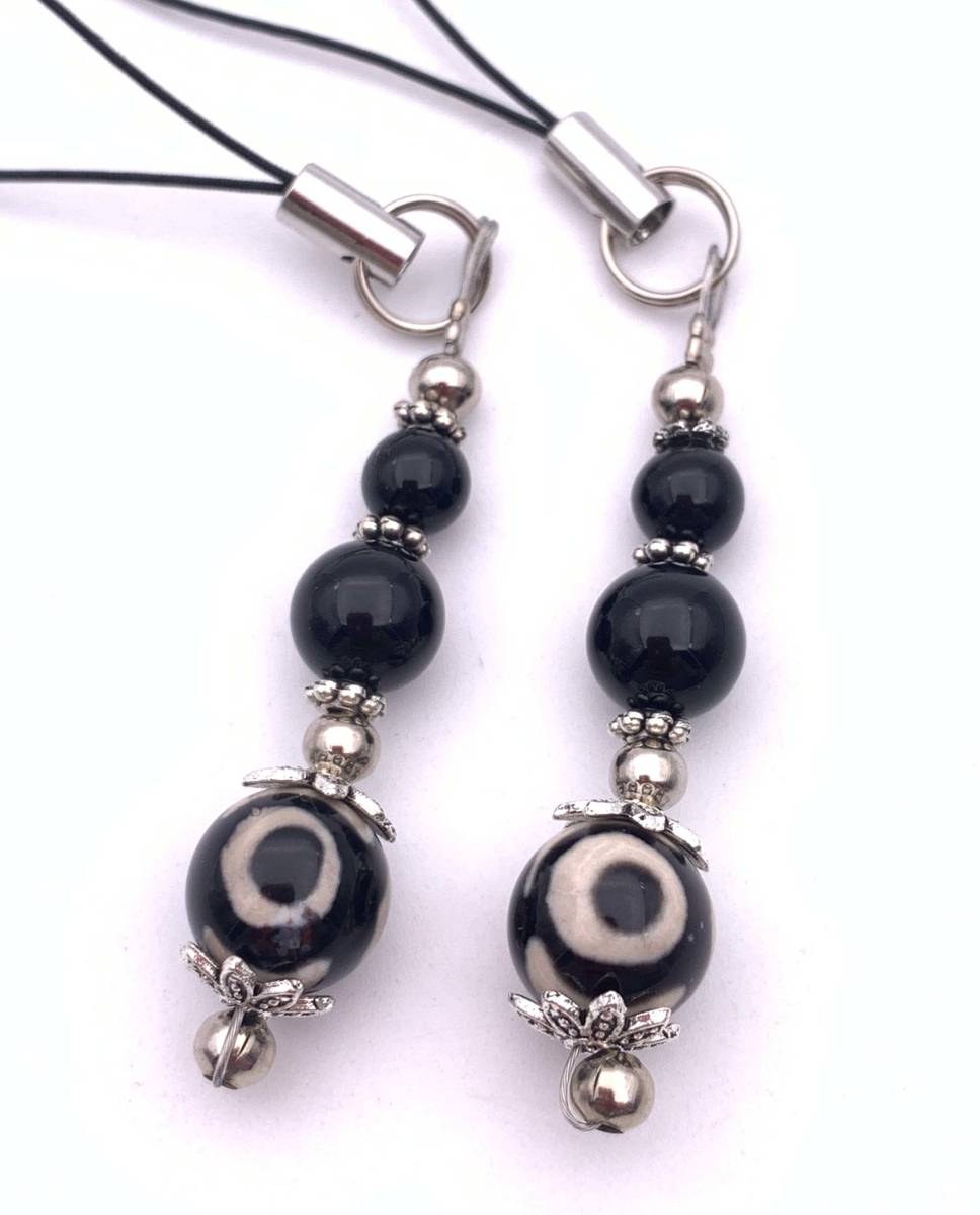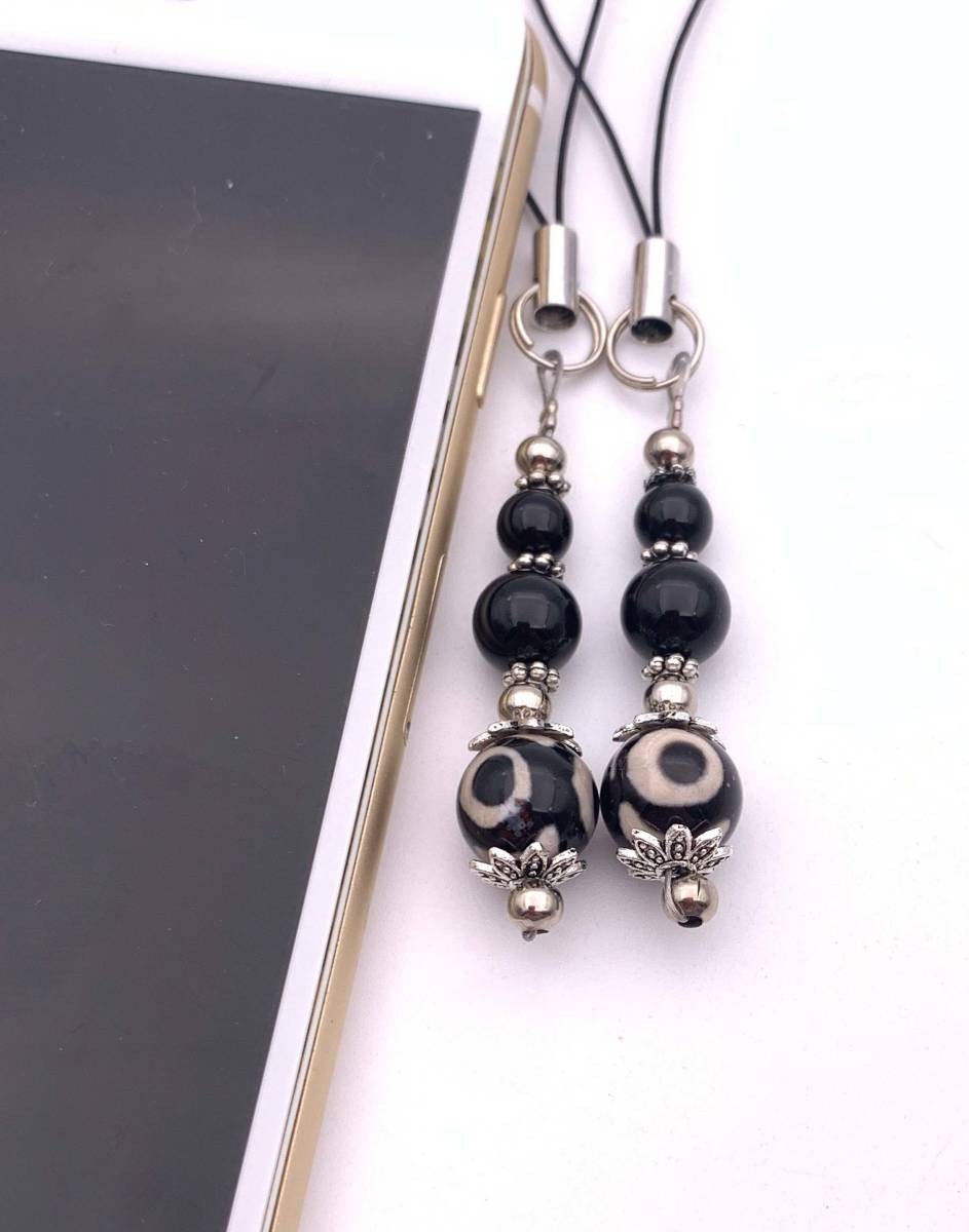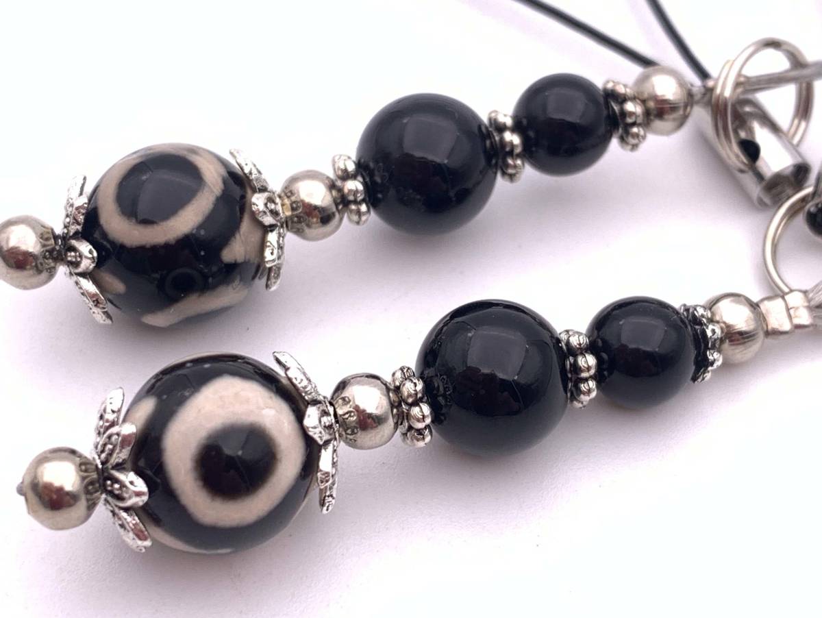 天然石三眼天珠&オニキスのペアストラップ
