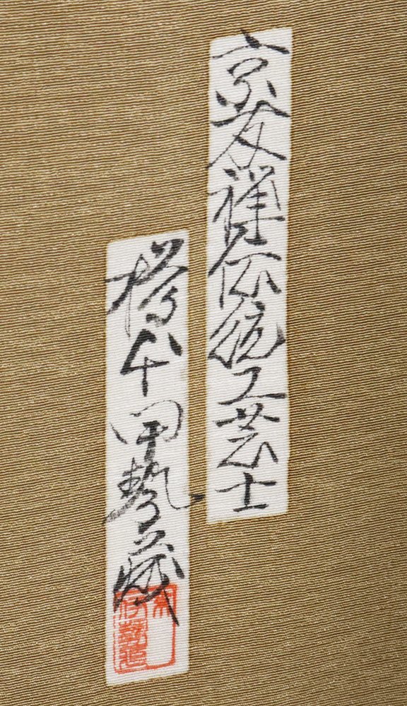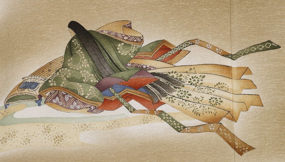 | 京友禅伝統工芸士 樽本伊勢蔵氏作 訪問着 袷 丹後縮緬地 東雲地 茶色暈し・小縞地 紫式部・清少納言・小野小町・琵琶 160 広襟 作家落款入り 一つ紋。 |