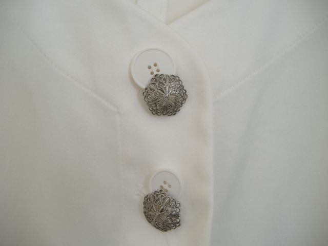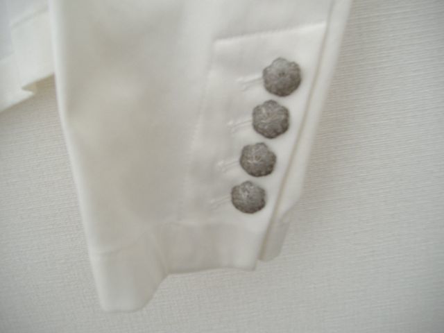 前後で丈が異なる遊び心のあるデザインです。セレモニーに最適ですが、白の替えボタンが14個付いていますのでボタンを付け替えて頂いてオフィスでも(画像3枚目の白のボタンは替えボタンです)。定価48,600円。