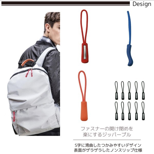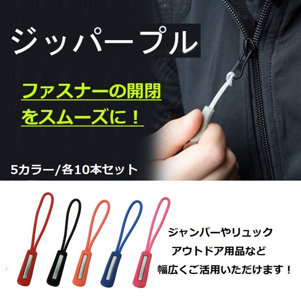 ・ファスナーの開け閉めを楽にするジッパープル、5カラー各10本セットです。ファスナーの引手に取り付けることで持ち手が長くつかみやいタブなります。手袋をしたままでもスムーズにプルアップが可能になり大変便利です。