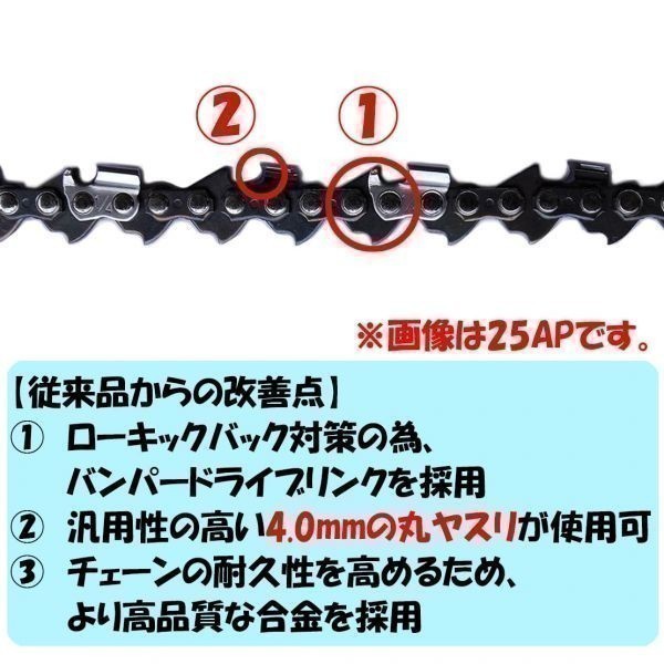 商品説明 | 【当商品は当店のオリジナル品(むとひろ製)です。オレゴン製ではありません。】 ■ 当店のこだわり ■ 弊社はチェーンソー販売の経験を活かし、 「大手メーカーに負けない"高品質・低価格"なソーチェンを作りたい」 こんな強い思いから、弊社オリジナルのソーチェンを販売することにしました。 数十社ある生産工場の中から、 高品質かつ、徹底した品質管理を行っている工場を厳選し、 大手企業の製品に負けない、品質のソーチェンの提供を実現しました。 また、弊社では生産工場より直接仕入れることで、流通コストを抑え、低価格を実現しました。 是非、お試しください。 ■ 商品説明 ■ ソーチェーン3本セットです。 メーカー:むとひろ 適合ソーチェン: オレゴン 25AP-52E ハスクバーナ H00-52E スチール 13RMS-52 ピッチ:1/4" ゲージ:.050"(1.3mm) ドライブリンク数:52 適合丸やすりサイズ:4.0mm 製造国:中国 ■ ソーチェン特長 ■ マイクロチゼルカッターはチゼルチェーンのもつ高性能はそのままに、保守の容易さ(保守の頻度や程度が少なくて済む)に大きな特長があります。 また丸みを帯びたチェーン構造によって、優れた耐久性をも兼ね備えています。 非常に軽く滑らかな切れ味のチェーンです。 ■ 従来の互換ソーチェンからの改善点 ■ ① ローキックバック対策の為、バンパードライブリンクを採用 ② 汎用性の高い4.0mmの丸ヤスリが使用可 ③ チェーンの耐久性を高めるため、より高品質な合金を採用 ■ ご注意ください ■ ソーチェーンを交換するときは、お使いのチェーンの「タイプ」と「長さ」を確認し、 同じ品番のソーチェーンをお選びください。 掲載写真の「オレゴン ソーチェーンの選び方」を参考にお使いのチェーンと一致するかご確認ください。 適合ソーチェンがわからない場合は、下記の項目をお調べいただき、お問い合わせください。 分かる項目だけで構いません。 ①チェンソー本体のメーカー名と品番。 ②ソーチェンのメーカー名。 ③ソーチェン一周のドライブリンク(ソーチェンがガイドバーの溝に埋まっている部分)の数。 ④ソーチェンのドライブリンク(ソーチェンがガイドバーの溝に埋まっている部分)に刻印されている数字。 ⑤カッター部(刃)に刻印されている文字。 ⑥ガイドバーの根元部分に刻印されている表記 |