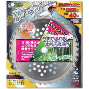 | 三陽金属(SANYO METAL)の刈払機用チップソー ホワイトシャークです。竹まで切れる本格千鳥刃付。軽量26-32ccの刈払機での山林や下草刈りに最適です。 【特長】 ●シャークスリットで衝撃を吸収! 刃欠けが少なくなっています(特許取得商品)。 ●JIS規格品。 ●竹・笹・雑木もよく切れる軽量タイプ。 ●木工鋸の様にアサリが大きく切り屑のはけが良い。 【仕様】 ●サイズ: φ255mm×40P ●材質: SKS-5 ●取付穴: 25.4[mm] ●製造国: 日本(播州三木) ※欠品時には申し訳ございませんが納期にお時間を頂く、もしくはキャンセルとさせて頂く場合がありますので御了承下さい。 ※商品改良のため、仕様・外観など予告なく変更する場合があります。 また画像と商品の色が若干異なる場合がありますのであらかじめ御了承下さい。 |