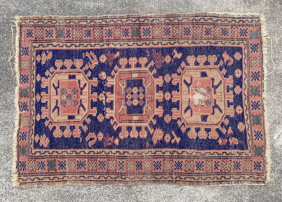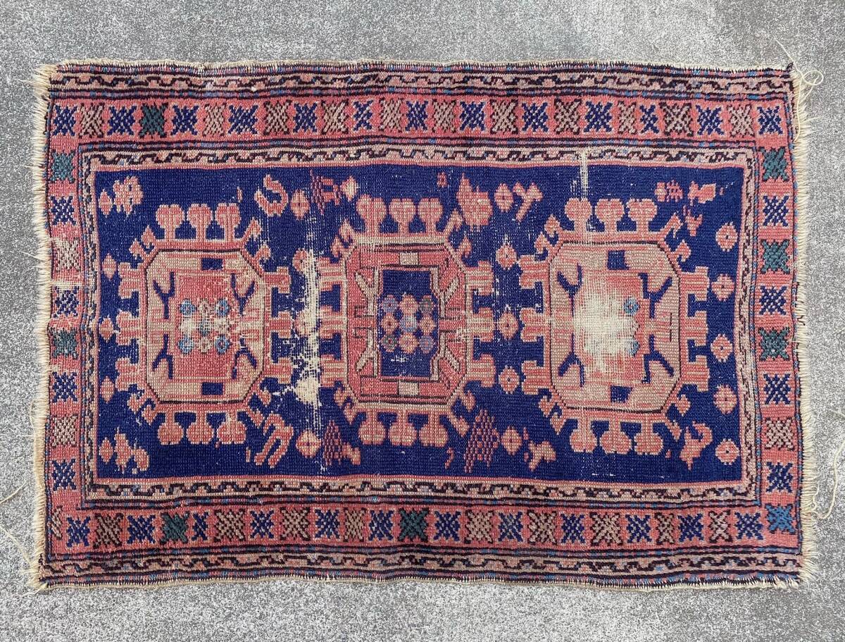 商品説明 | ■商品説明■ アメリカで使われていたアンティーク ラグ です。産地は西アジア近辺(推定)。推定1900年以前~1920年代頃までの物( 経年100年以上)だと思います。長年使い込まれた凄みのある風合いです。大変古い物になりますので現状渡しが前提のお取引となります(ダメージの無い物をお求めの方、細かな状態が気になる方には完全に不向きなお品です。※ご注意ください)。 ■実寸((フリンジ状の部分を除く。※測り方、測る位置等の違いにより計測値に容易に差が出ます。およその数値とお考えください。計測値に関するクレームはお受けできません。ご心配な方は入札をお控えください。※古いラグの多くがそうだと思いますが、正確な長方形ではありませんので対辺の長さはそれぞれ異なります(4辺全て長さが違います)。 約99.5cm x 約69cm前後 ■状態 :※現状渡しとさせていただきます(※ダメージの無い物をお求めの方、細かな状態が気になる方には不向きなお品です。※ご注意ください)。※出品物のような状態のラグをあえてお探しの方、好きな方、各ダメージも「味」としてご理解いただける方向けのお品です。細かな状態が気になる方には完全に不向きなお品です。ご注意ください。 中央付近に穴、破れ、裂けと補修箇所があります。 4辺各部にほつれ、破れ、裂け、穴、スレ、擦り切れ、薄くなった部分、抜けたウール繊維の付着、パイルが抜けやすい部分、汚れ、糸補修、塗料?の付着 等。入手後に洗浄、掃除機、ブラシがけによる抜けたウール繊維等の付着物の除去を素人なりに念入りに行いましたが完全ではありません。残りは落札者様の方でお願いいたします。見落としはご容赦くださいませ。 ※現物の色が画像にうまく出ておりません。現物の色や状態が画像にうまく出ないことがございます。色褪せ、ヤケ、黄ばみ等は特に画像に出にくいです。画像は素人が撮影しております。ご覧になっているPCのモニタやスマホ等の画面と現物の色味が異なる場合や現物よりきれいに状態良く写ってしまうことがございますが予めご了承くださいませ。 状態について過度に神経質な方には不向きです。汚れやダメージ箇所の全てを画像に載せたり説明することは困難です。画像や状態説明では確認できない使用に支障が無い範囲においての汚れ、ダメージ、補修 等があるかもしれませんことを、画像と現物の色味に差がありますことを予めご理解ご了承いただいた上での入札をお願いいたします。クレームや返品・返金・交換等はお受けできません。不安な方は申し訳ございませんが入札はお控えくださいますようお願いいたします。 ご不明な点、ご要望等(対応できないかもしれませんが)がございましたら必ず入札前にお問い合わせくださいませ。 | |