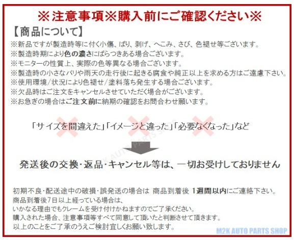 輸入品ですので、新品ですが製造時、配送中に付く小傷などは御了承下さい。 製造時のほつれ、よごれ、やつれ、しみ、小さな破れや仕様違い発生する場合ございます、神経質な方ははご遠慮下さい。 ■受注生産・在庫欠品の場合は別途納期をお知らせいたします。 ※お急ぎの場合は必ずご注文前に納期の確認をお問い合わせ願います。 海外の工場にて作製されております、欠品になりますと 納期が1~2ヶ月以上かかる場合ございます。あらかじめご了承ください。 写真は、イメージ図となる場合がございます ※本商品は、予告なく仕様および外見を変更する場合がございます。 交換・返品・キャンセル等は、一切お受けしておりません。 初期不良・配送途中の破損・誤発送の場合は 商品到着後 1週間以内にご連絡下さい 使用環境/状況により色褪せ/塗料落ち発生する場合ございます。クレーム対応お受けできませんのでご了承ください。 本製品の使用または使用不能から生ずる損害 (事業利益の損失,事業の中断,事業情報の損失又はその他の金銭的損害を含む)に関して、 当店は一切の責任を負わないものとします。 取付に関する費用・工賃などはお支払ができかねます。 |