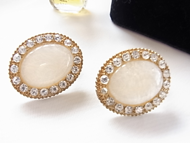 ビンテージ/ヴィンテージ 乳白色のマーブル調のシェル調にラインストーンが囲んで綺麗な輝石 大き目華やか ゴージャス感 イヤリング☆