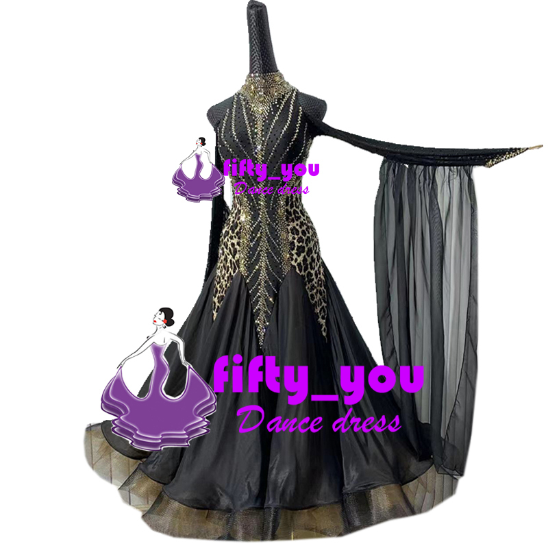 新品fifty_youレディース社交ダンス衣装 セミオーダー ライトストーン飾 モダンドレス スタンダードドレス高級衣装 黒色+ヒョウ柄