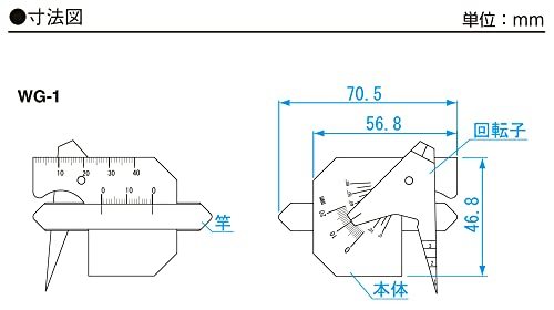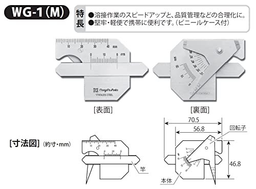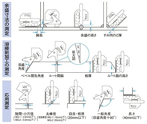 ・ WG-1・溶接の余盛、すみ肉の大きさ及び角度等の測定に・長さ寸法測定精度(mm):±0.4 / 角度測定器差(°):±0.7 / 隙間測定器差(mm):±0.4 / のど厚測定器差(mm):±0.4・本体直尺目盛(mm):40 / 余盛高さ(mm):10 / すみ肉脚長(mm):20 / すみ肉のど厚(mm):10 / ルート間隔(mm):0.5-3 / 丸棒径(mm):10 / 開先(ベベル)角度(°):0-60(最小読取5)・本体寸法(mm):W70.5×H46.8×D8 / 本体質量(g):74・原産国:日本溶接の余盛、すみ肉の大きさ及び角度等の測定に 溶接作業のスピ-ドアップと品質管理等の合理化に最適です。 堅牢、軽便で携帯に便利(ビニールケース付)です。 合格書付です。