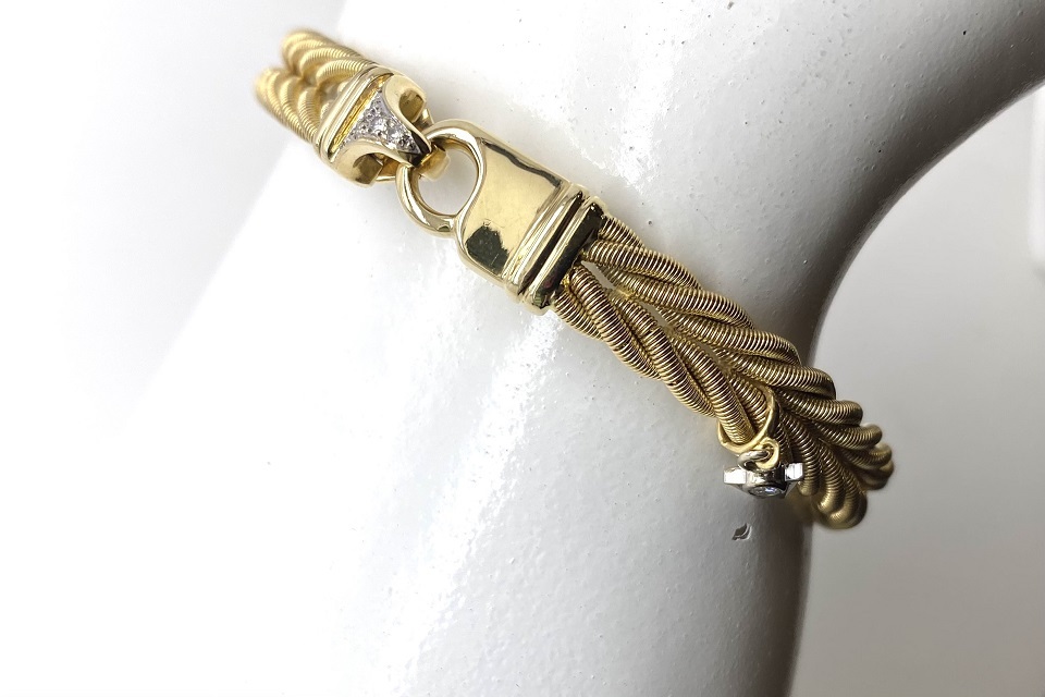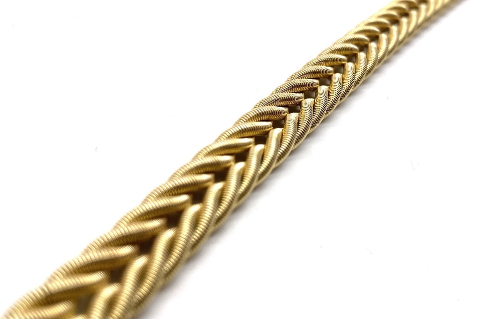 解説 | エルンスト・アレクサンダー・ウェレンドルフ氏は最高峰のジュエリーを創作するという高いヴィジョンを掲げ、ドイツのフォルツハイムに工房を開設。やがて、欧州の王侯貴族、ロシア皇帝、英国王室までも顧客リストに名前が刻まれるようになります。審美眼の鋭いセレブを満足させてきた作品は極上感を醸し出すブルジョワシック。 当作品は、極細のゴールドワイヤーを複雑に編み込んだ月桂樹を想わせる作品。 |