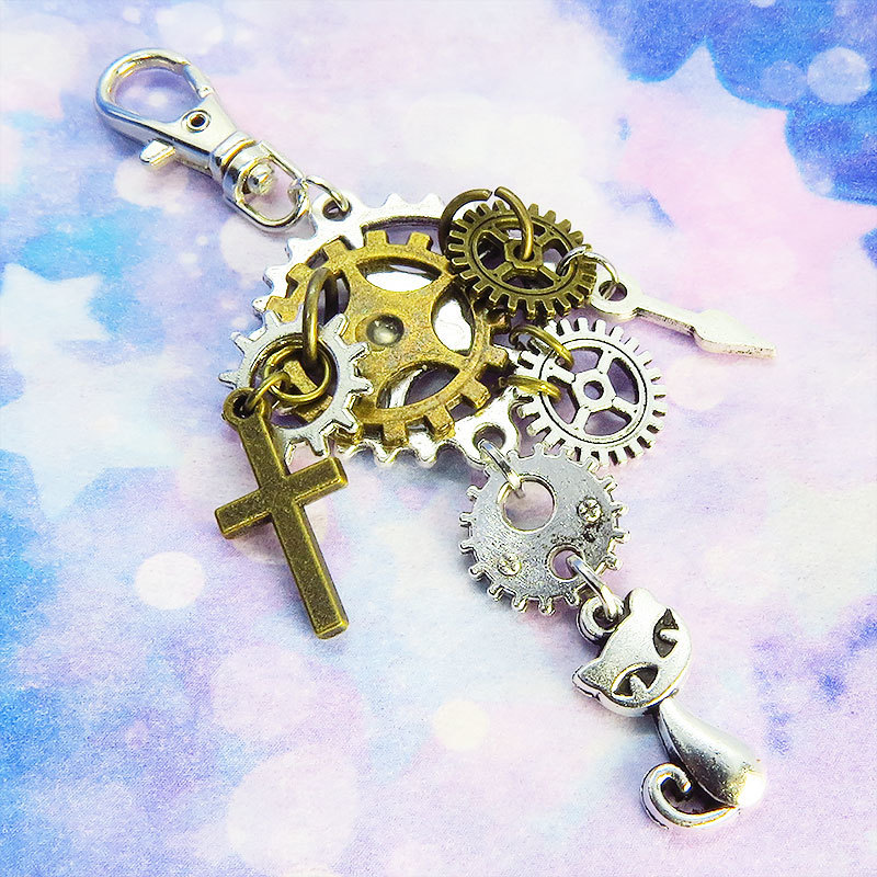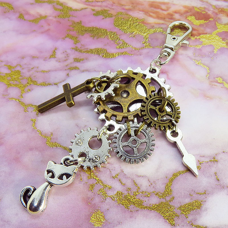 猫とギア・歯車で構成されたスチームパンク風のファスナーチャーム・キーホルダーです