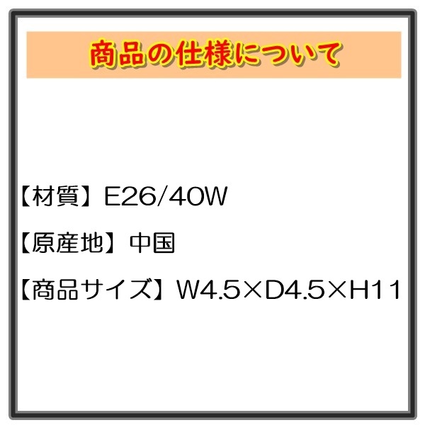 ![]() エジソン球 SS EDB-92 6個入り 商品の仕様について 【材質】E26/40W 【原産地】中国 【商品サイズ】W4.5×D4.5×H11 ◇◆発送について◆◇