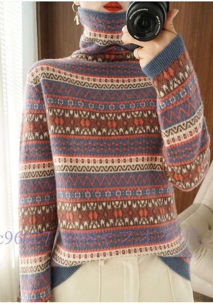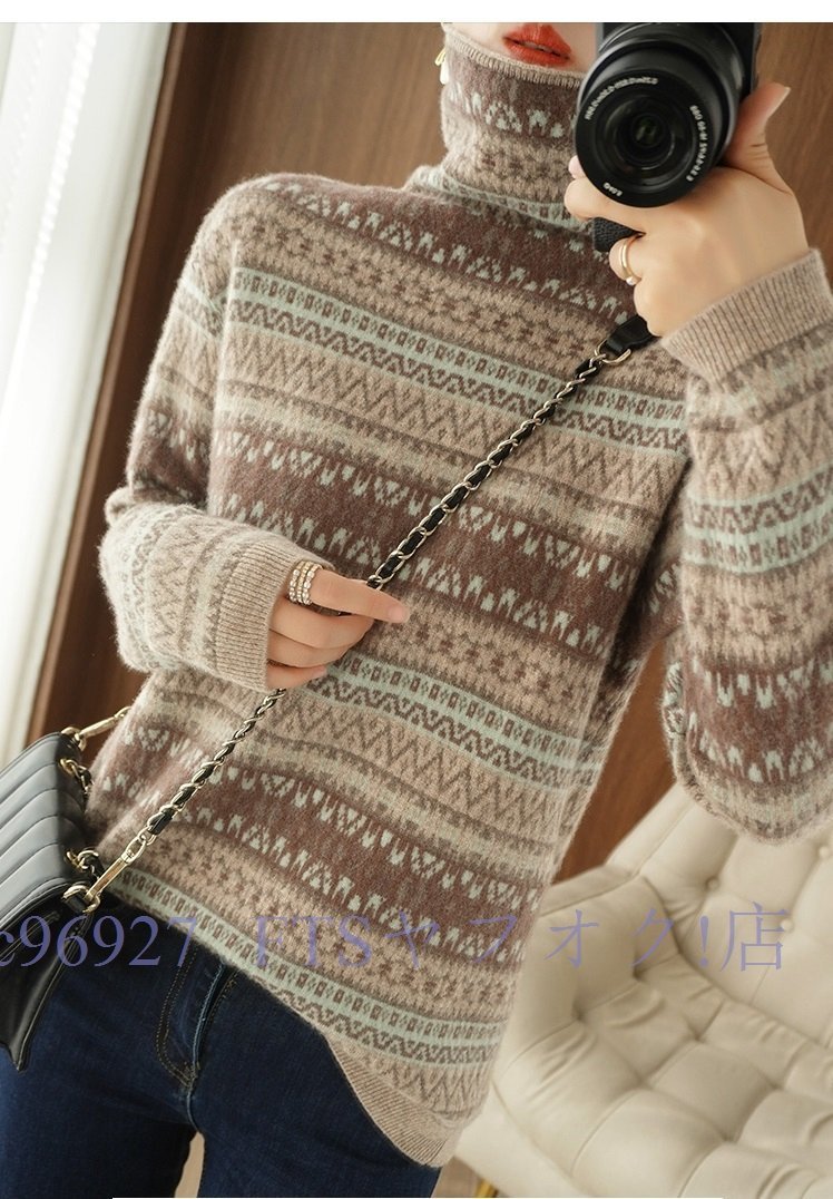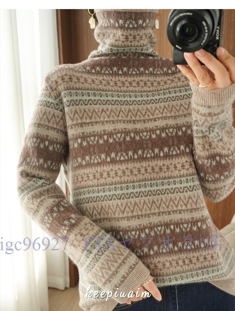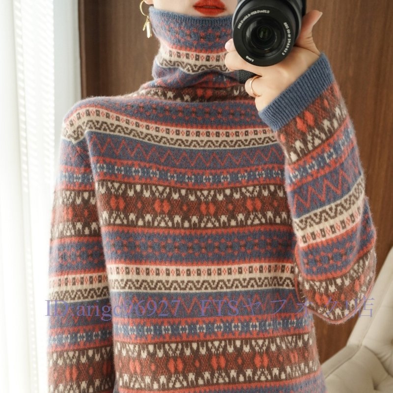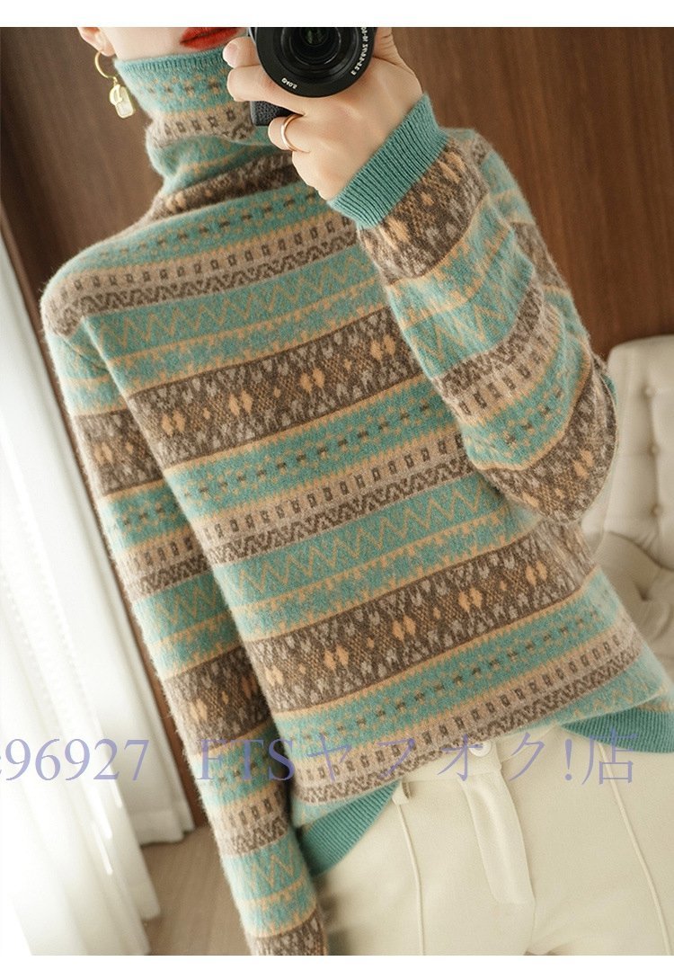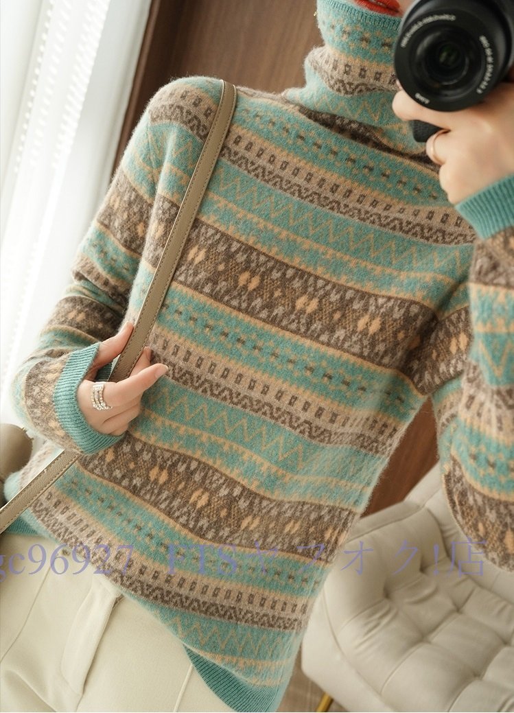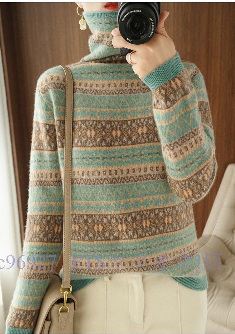 A6617☆新品秋冬 ニットトップス 綺麗 プリント柄 カシミヤ混 長袖 セーター キレイめ 大人 ニットセーター 緑