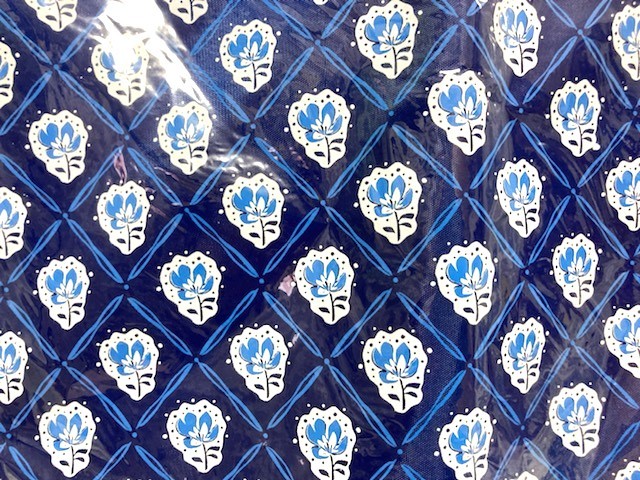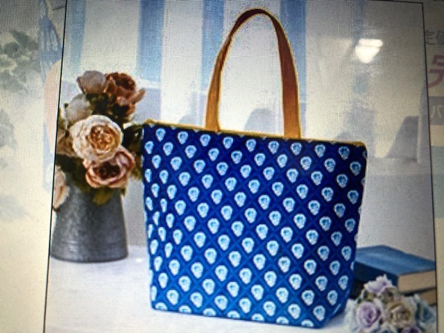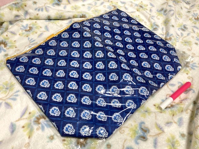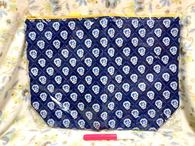 ♪全体が紺色に近い濃いブルーにお色目で、片面は青い花柄が規則的にデザインされている、南仏プロヴァンス風の爽やかなイメージです。口のファスナー&持ち手は黄色です。
