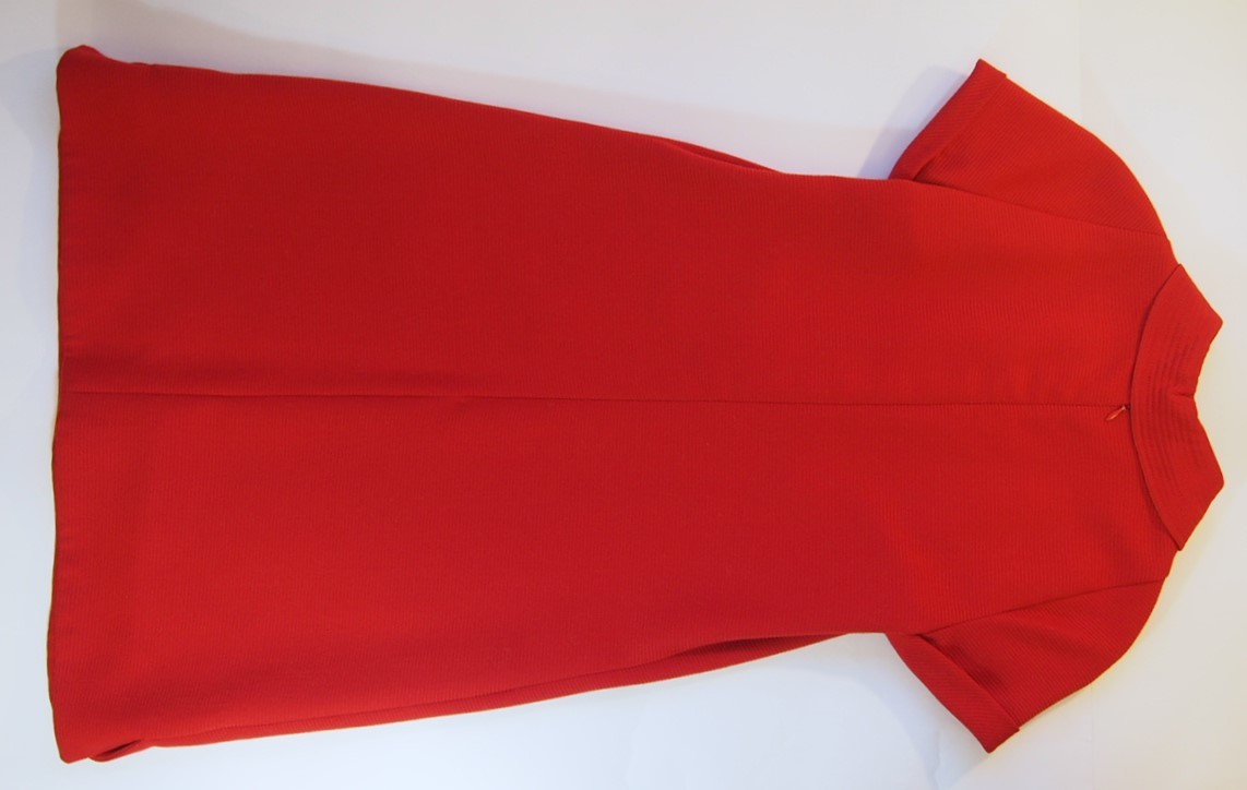 本体ウール100%。裏地付。ウールは表面に凹凸のある細い畝の地紋のある織り方で、しなやかですがほどよい厚みと張りがありますので、体の線を全く拾わず、スタイルがよく見えるシルエット。Aライン裾広がりで脚が綺麗に見えます。 お色は赤。朱赤系ですが朱が主張すぎない深紅といいたくなる鮮やかな赤です。(*お色の感じ方は人それぞれですのでご留意ください。オレンジでもワイン系でもなく地味ではない鮮やかな赤です)ウールで地紋に凹凸畝がありますのでお色身に深みも多少あります。(画像で右側が明るく映ってしまいましたが、照明の関係ですので色むらはありません)