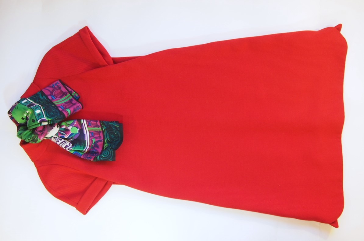 都内のジャンニヴェルサーチ GianniVersace 直営ブティックで購入しました、鮮やかな赤でシンプルなラインがとても可愛い、シルクスカーフ付きのワンピースです。