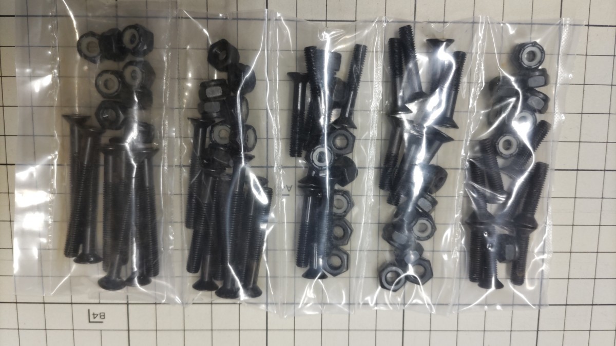 スケートボード用トラック取り付けネジ8本入りのサイズ違い5タイプのセットです。上から7/8ライザー無しの直付け用、1番右は長さ約45ミリになります。ショップで売られている物になります。スケートボード関係多数出品中です。