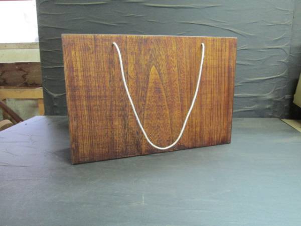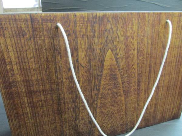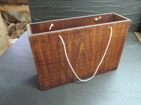 厚さ1cmの桐の一枚板2枚用意し木のトートバッグを作りました。木目の美しさを強調するために丁寧な拭き漆を行って仕上げました。この木のトートバッグを作るに当たって最も気を使った事はバッグの重さでした。その重さは800グラムで仕上げる事ができました。又取っ手については綿の太紐を使い仕上げました。