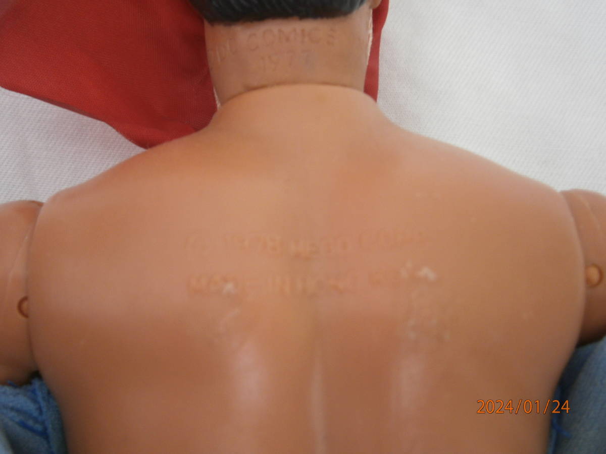 商品説明 | アンティーク スーパーマン フィギュアです。 非常に希少な商品です。46・7年前のものです。 本体はプラスチック製です。頭部はソフビ 高さ約31cmです。 自立するタイプです。 首回ります。 肩回ります。 肘曲がります。 手首回転します。曲がります。 腰回ります。少し前後ろに曲がります。 足の付け根が回ります。 膝曲がります。 目立ったダメージはありませんが、かなり古いものになりますので、シミや汚れ等が衣装にあります。あらかじめご了承ください。 | |