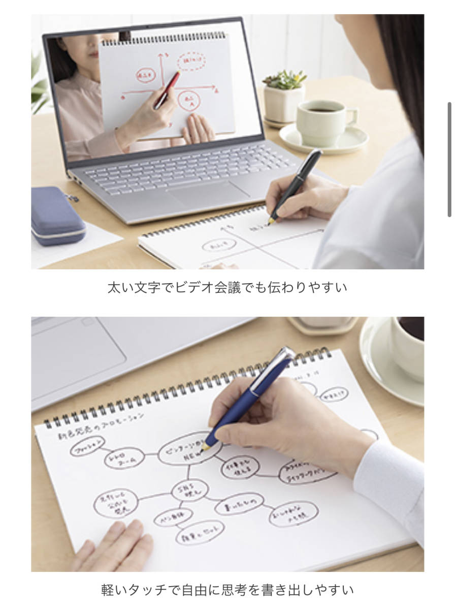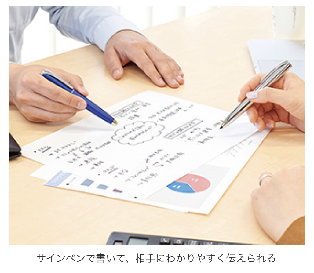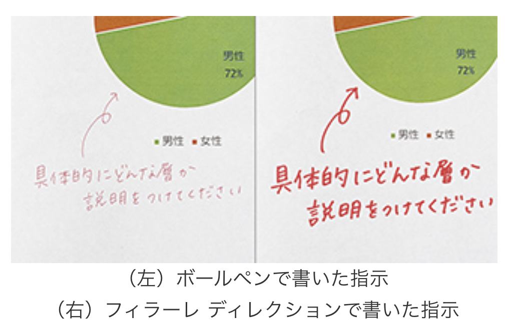 品番 P-WYSS68-BK 「フィラーレ ディレクション」の特長 従来のサインペンは、ボディがプラスチック素材のものが多かったのですが、今回は金属素材を使用し、ビジネスシーンでスマートに使える高級感のあるデザインにしています。伝えるポイントを指し示す時に握りやすい軸の太さにし、指すところが目立つように先端を金色にしています。 インクは、空気中の水分を吸収しキャップがなくても乾かない※、ゼブラ独自のモイストキープインクを採用しています。ペンの軸をひねってペン先を出すツイスト式でキャップを開け閉めする手間がなく、仕事に集中することができます。 サインペンとボールペンの見え方の比較 サインペンはボールペンに比べて筆記線が太く、相手に見えやすい文字を書けることが特長です。 資料の添削など仕事の指示をする時に、サインペンを使用し、どこを修正すればよいのか、指示を相手に見せることで、イメージを共有しやすくなります。 今回発売する商品は、キャップのないツイスト式なので、すぐに書いて相手に見せることができます。 モイストキープインクとは ゼブラは、空気中の水分を吸収する吸湿性のある成分を多く配合した、「モイストキープインク」を開発しました。その場の湿度の変化に応じて、水分の吸収と蒸発を繰り返し適度な状態を保つため、キャップがなくてもペン先が乾燥せず書き続けることができます。