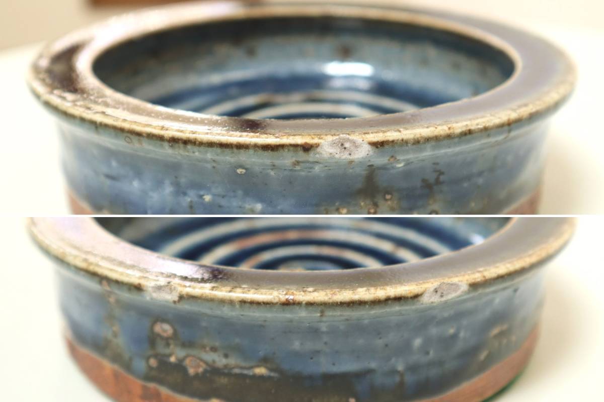 口縁外周り3箇所に浅い欠けが見られますがひびや補修痕などは無く、ヴィンテージとし ては良いコンディションです。(6枚目画像参照) 画像の白い部分や色の薄い部分は光の反射によるもので色抜けなどは有りません。 欠けの他に疵などはほぼ見られず、全体に艶も有って使用感は多少感じられる程度です。 内底面に釉薬斑が見られます。(4枚目画像参照) ヴィンテージ品には釉薬ロスやスポット、色斑、小さな窯疵や歪みなどが見られる場合も 有りますが、これらが製造された時代の製造技術、出荷基準では通常品扱いで販売された ものとして、ご理解をお願い致します。 経年や使用に伴う劣化、汚れ、疵などについては、出来るだけ詳細に説明をしていますが 細かな状態の全てを記載することは出来ません。 また、状態についての受け止め方は個 人によって其々異なりますので、ご不明な点など御座いましたらどうぞご遠慮なくお問い 合わせ下さい。 |