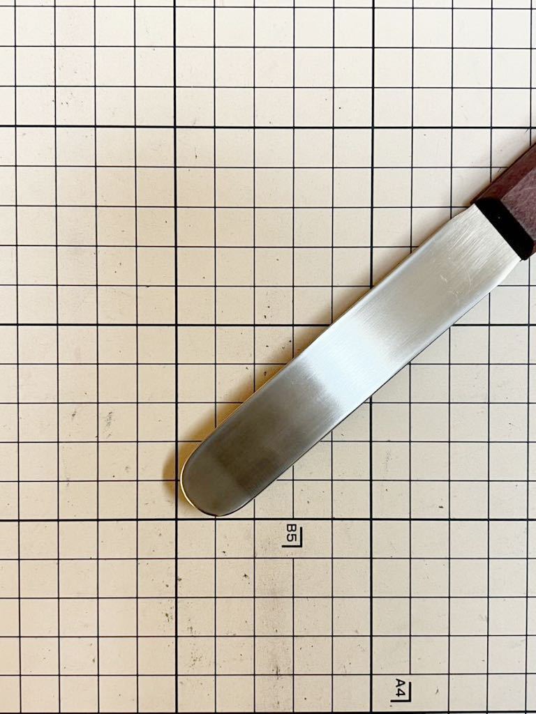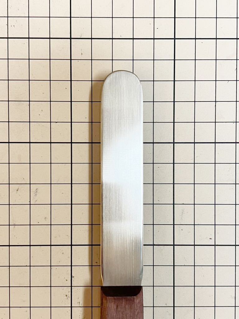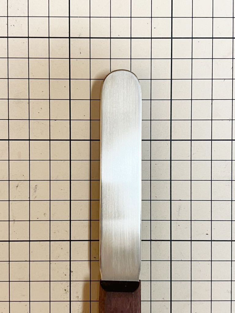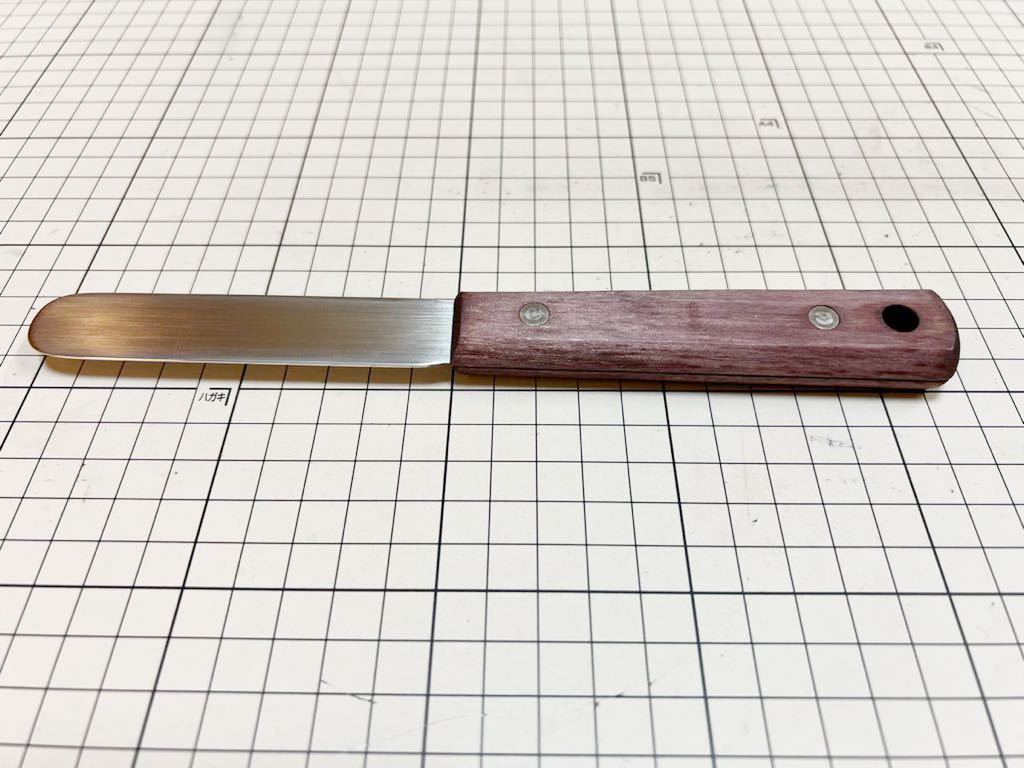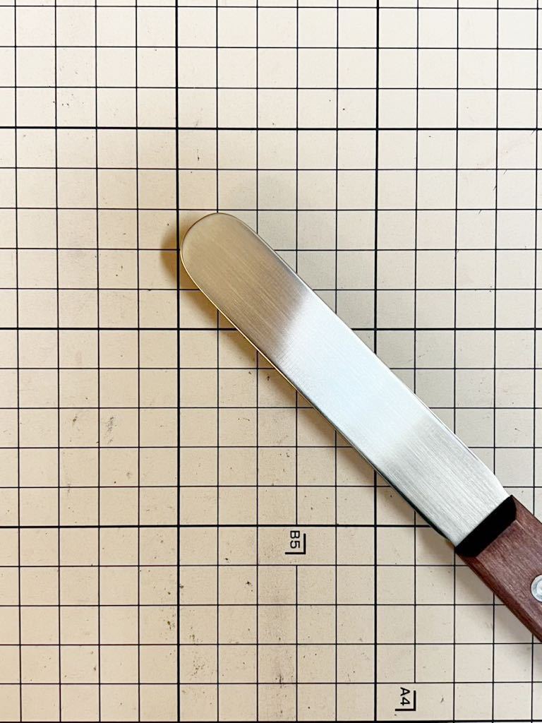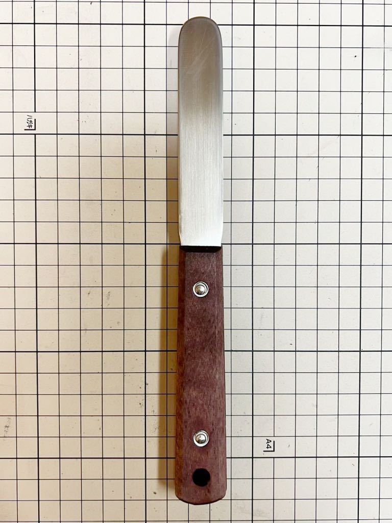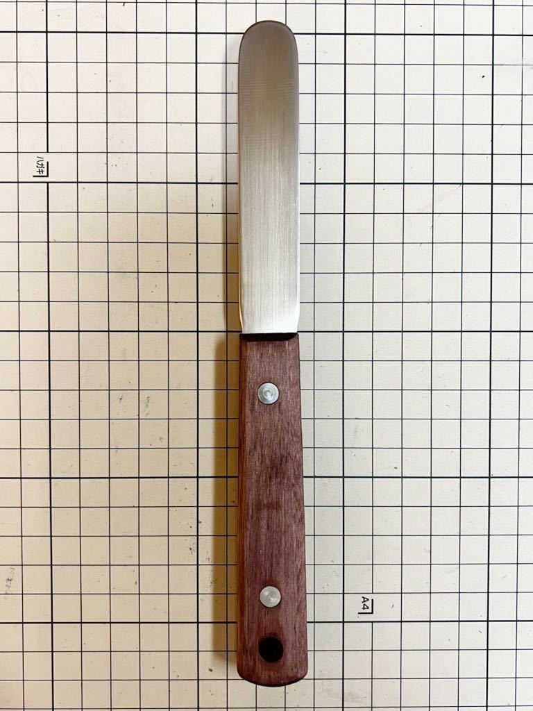 素材はステンレス製で錆びにくく、あえてヘラ部分を短くしているので、しなりは 少なめになります。